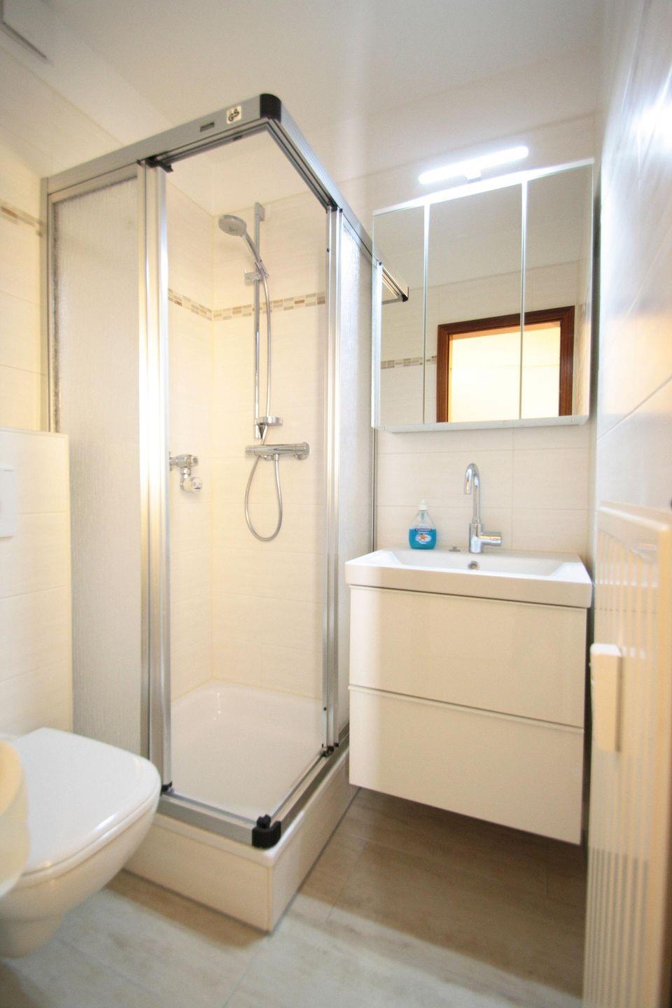 Das innenliegende Duschbad lädt durch helle Sandtöne zum Aufenthalt ein.