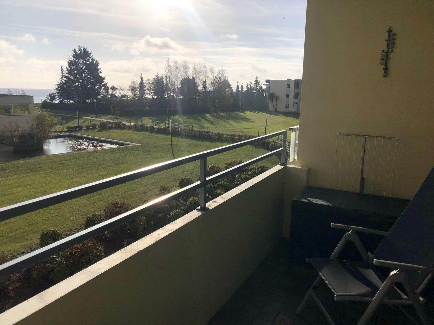 Vom möblierten Balkon genießen Sie mit dem Blick auf das Meer und Sonne von morgens bis spät nachmittags Ihren Urlaub!