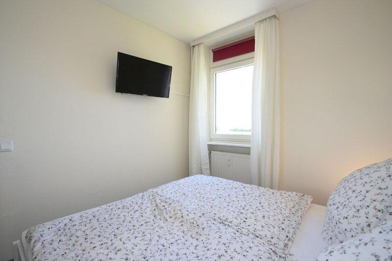 Das Schlafzimmer mit Doppelbett (180*200 cm) verfügt über einen weiteren Fernseher. Hier steht ein Kleiderschrank mit 2 Schiebetüren, eine davon mit großem Spiegel, für Ihre Urlaubsgarderobe bereit.