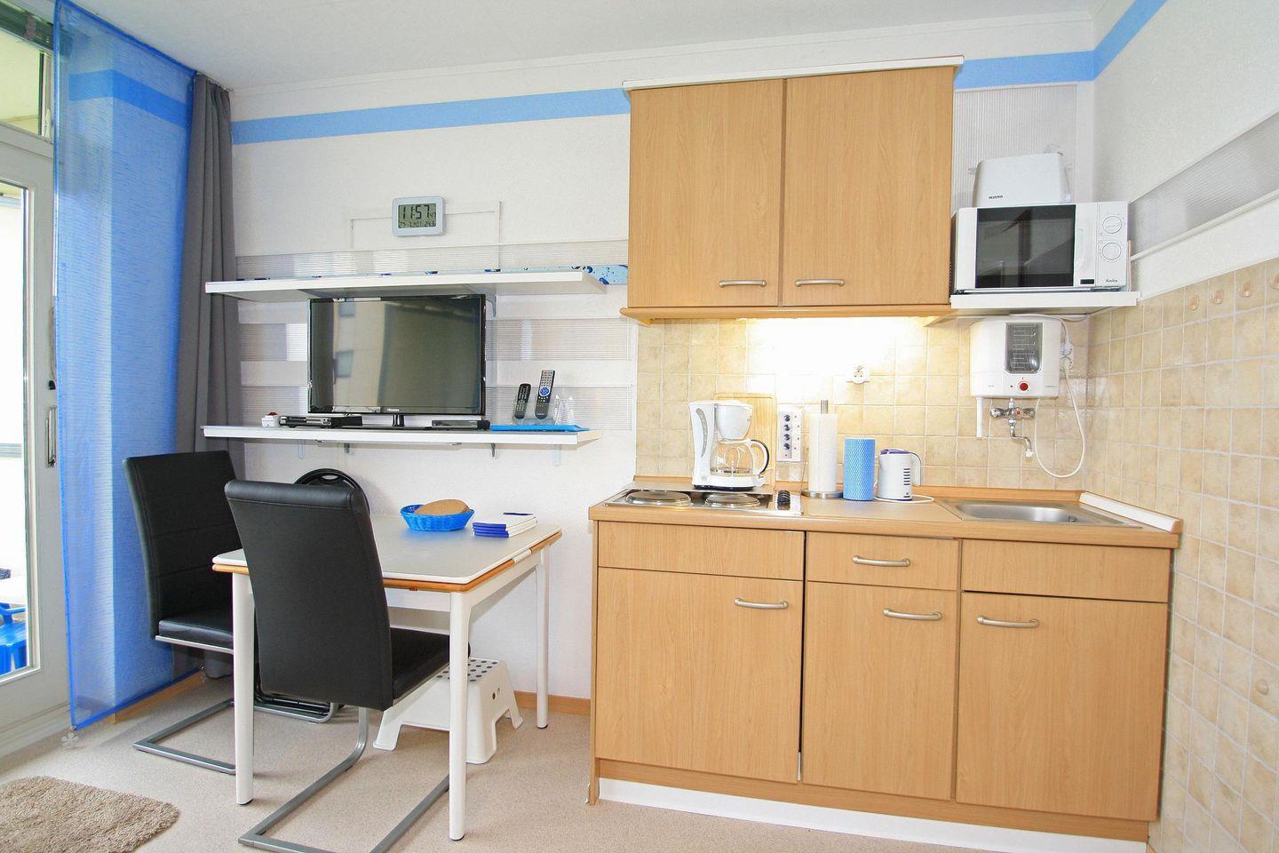 In der kombinierten Wohnküche finden Sie ein gemütliches 3-er-Sofa (welches bei Bedarf als Schlafmöglichkeit für kleine Gäste dient), Schwingsessel sowie Esstisch und kleine Küche. Microwelle, Vier-Platten-Kochfeld, Kühlschrank mit Tiefkühlfach sowie ein Mini-Backofen im Abstellraum stehen Ihnen zur Selbstversorgung zur Verfügung.