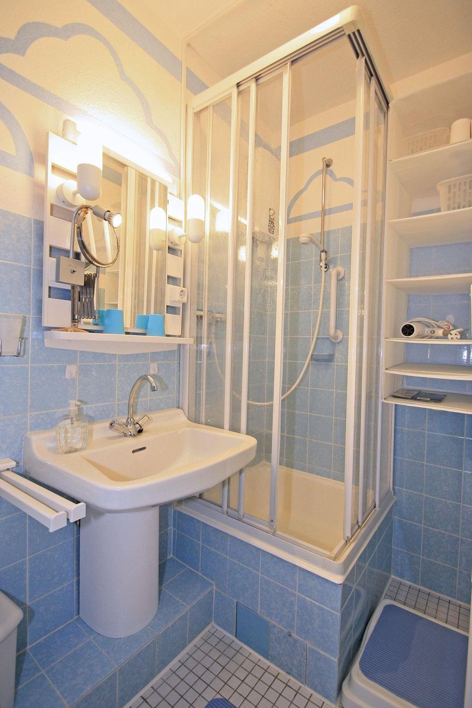 Das kleine, innenliegende Duschbad mit fester Duschwand, Handtuchheizkörper und beleuchtetem Spiegel, Kosmetikspiegel und Steckdosen ermöglicht Ihnen einen entspannten Start in den Tag.