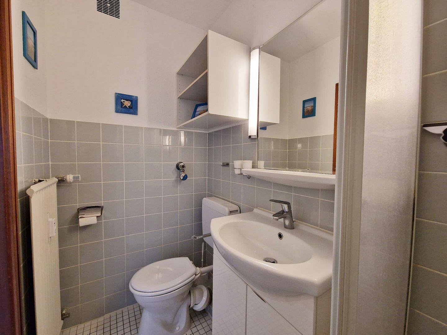 Im innenliegenden, zweckmäßigen Duschbad finden Sie eine Dusche mit fester Duschwand und hohem Einstieg, Haartrockner und Steckdose sowie beleuchteten Spiegel vor.