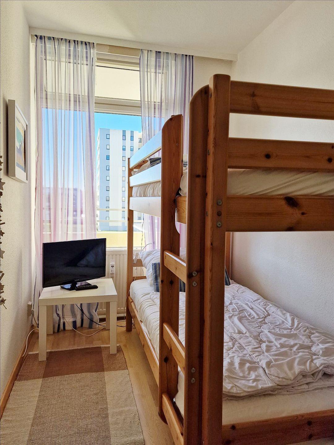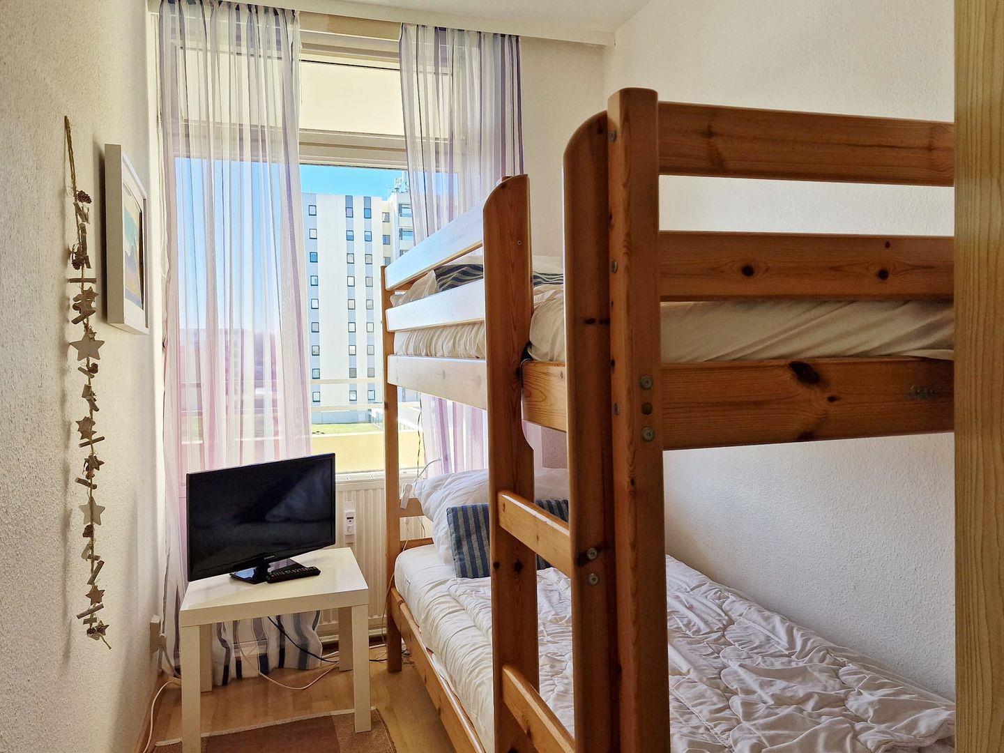 Das separate Kinderschlafzimmer wurde mit Etagenbett, einem weiteren TV und zweitürigem Kleiderschrank ausgestattet.