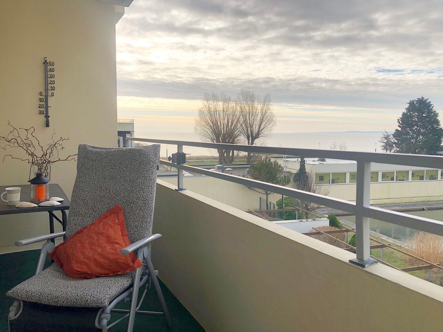 Vom möblierten Balkon haben Sie einen seitlichen Blick aufs Meer und finden hier von mittags bis abends ein sonniges Plätzchen.