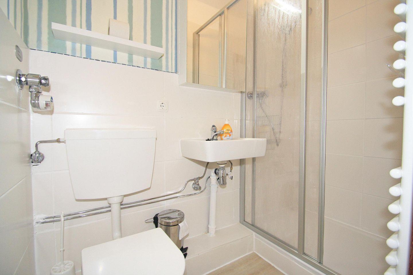 Das innenliegende, kleine Duschbad bietet Ihnen eine Dusche mit flachem Einstieg, fester Duschwand, Handtuchheizkörper und einen beleuchteten Spiegelschrank.