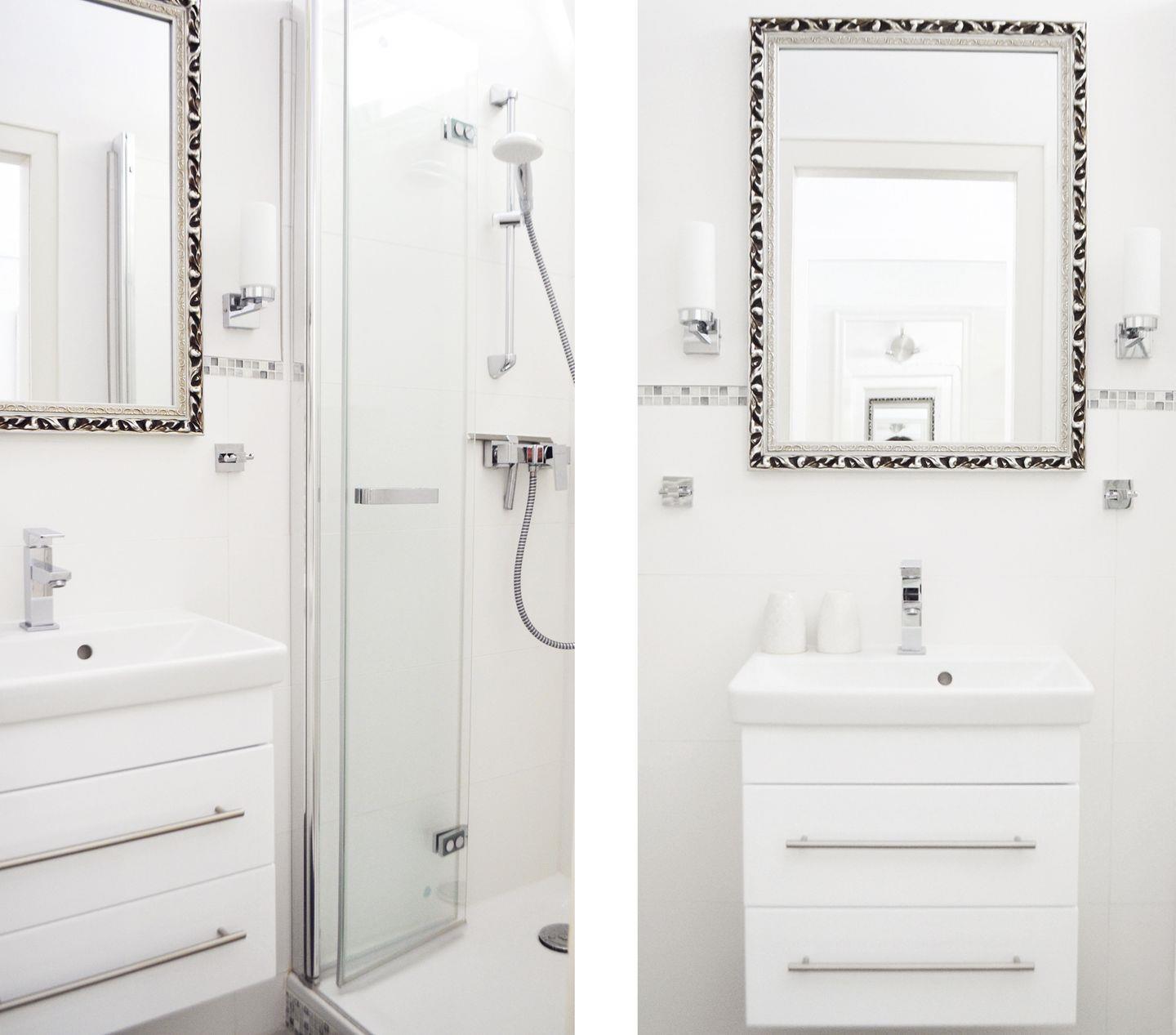 einem Handtuchheizkörper und einem beleuchteten Spiegel und 3 Steckdosen ausgestattet.