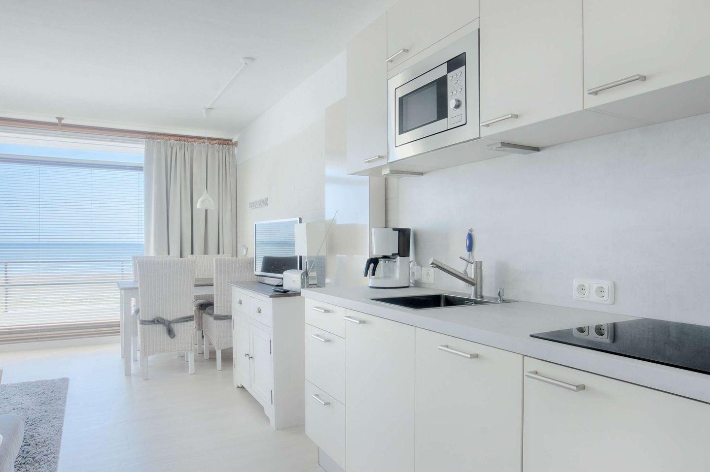 auf das Meer bietet. Die Küche verfügt über einen 4-Feld-Ceranherd, einen Geschirrspüler, Kühlschrank