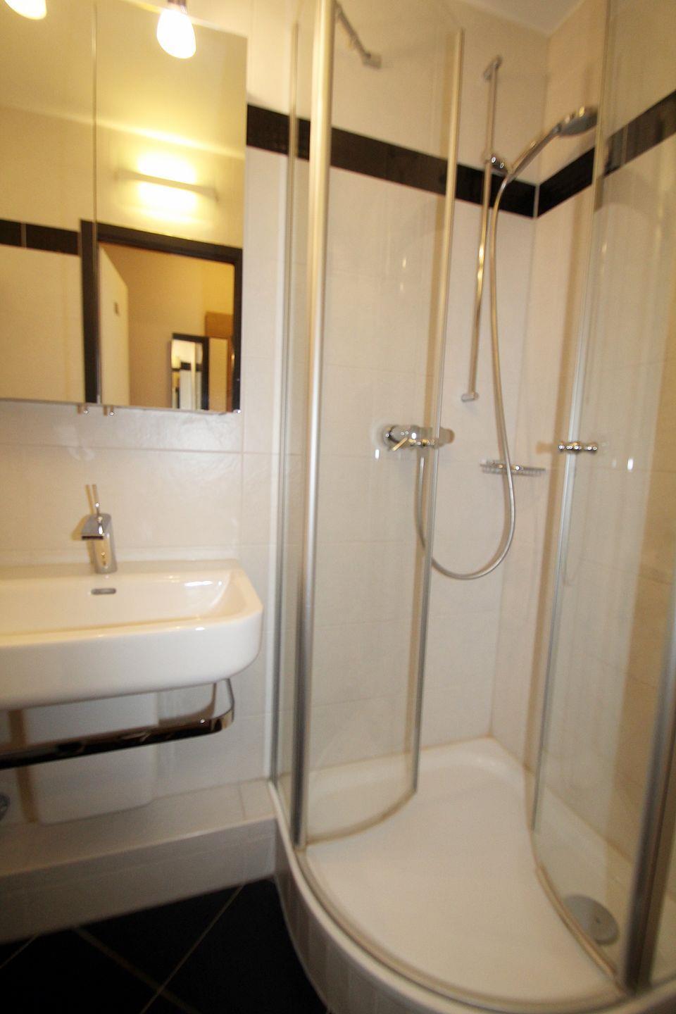 Im kleinen, hochwertig sanierten Badezimmer finden Sie neben dem beleuchteten Spiegelschrank noch zwei weitere Schränke in denen sich auch während einem längeren Aufenthalt jede Menge Stauraum findet. Das innenliegende Bad ist mit einer Glas-Duschkabine ausgestattet. Ein praktische Unterputzradio im Bad bringt mit einem Tastendruck Schwung in Ihren Morgen.