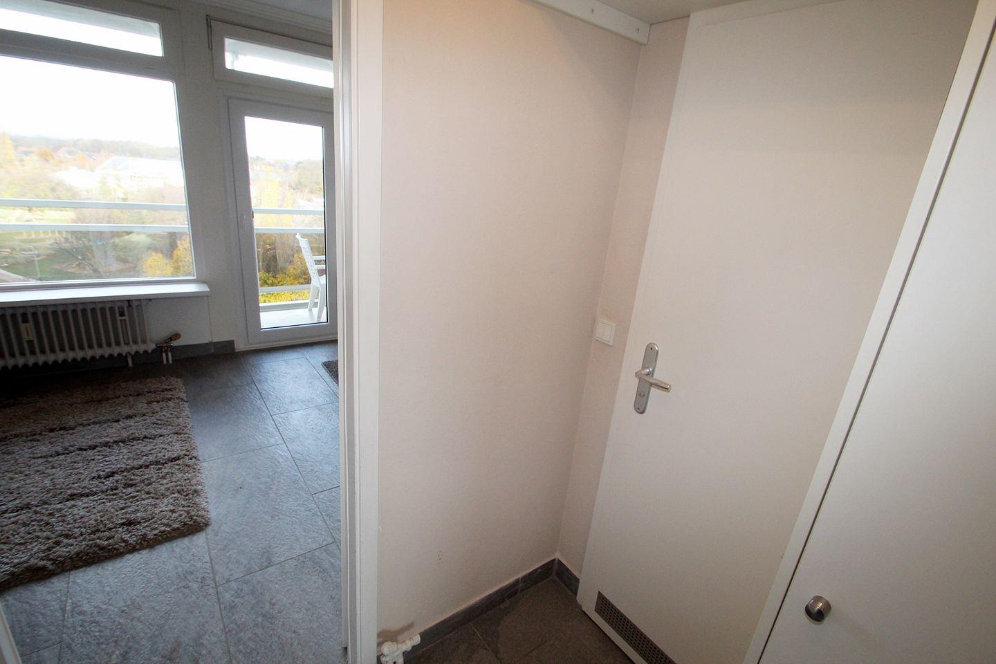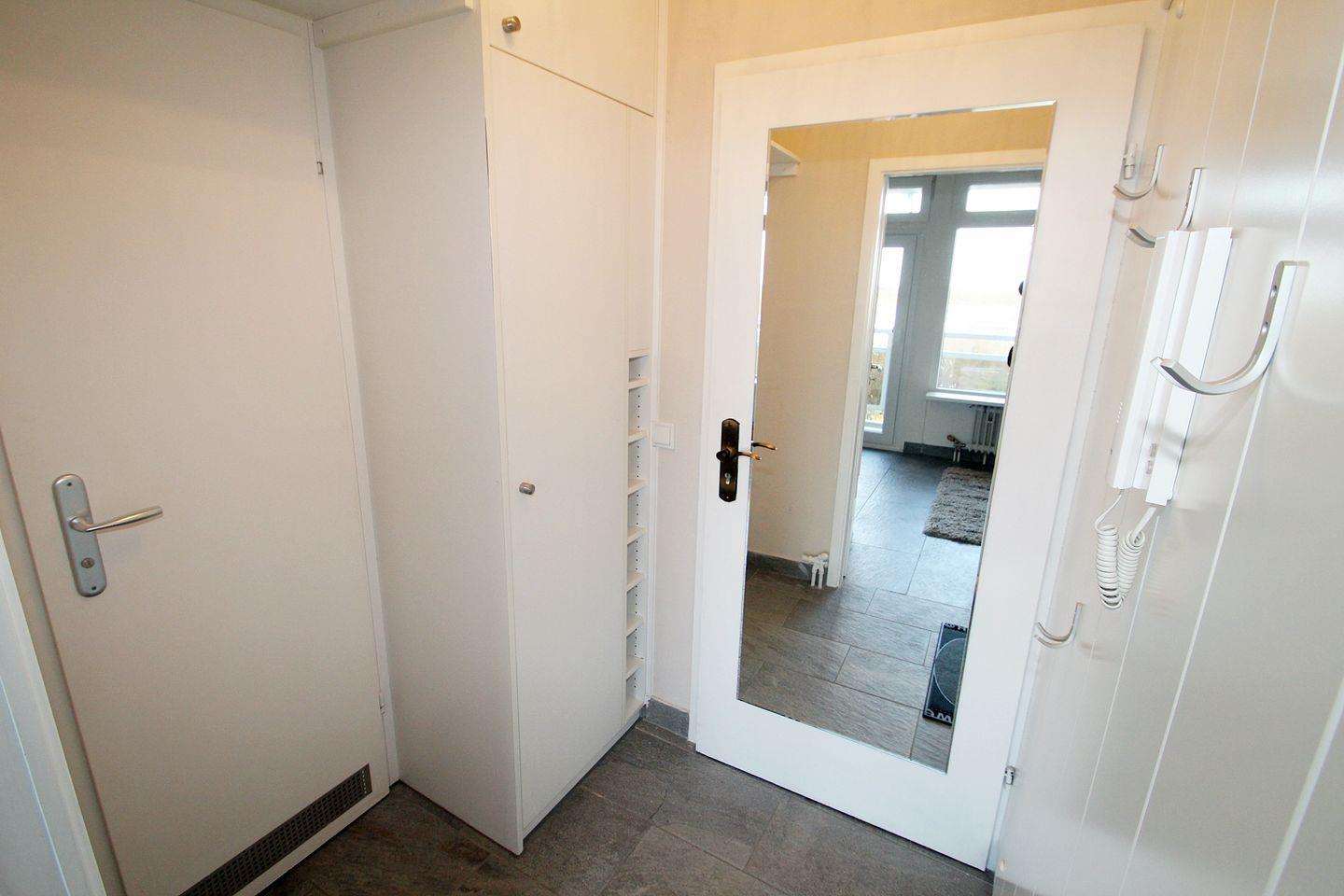 Das 23 qm große 1-Zimmer-Appartment im 7. Stock verfügt über einen kleinen Flur mit Ganzkörperspiegel, Einbauschrank, Garderobenhaken und Gegensprechanlage.