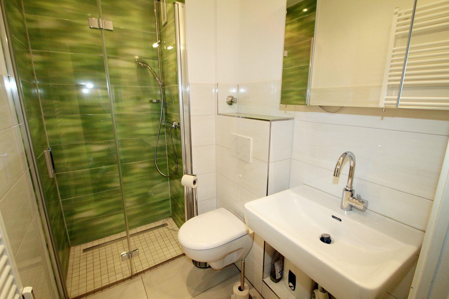 Das stilvolle, innenliegende Duschbad wurde bei der Sanierung mit einer bodengleichen Dusche, zweiteiliger Glas-Duschwand, beleuchtetem Spiegelschrank, Steckdose und einem Handtuchheizkörper ausgestattet.
