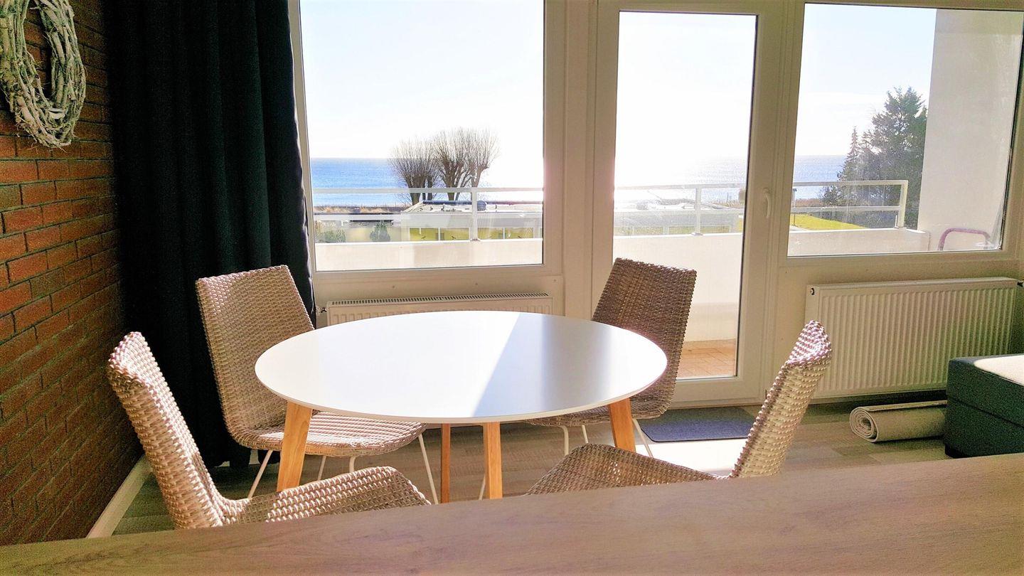 Der Essbereich ist mit bequemen Korbstühlen und einem runden Tisch ausgestattet und bietet genug Platz für gemeinsame Mahlzeiten oder sonstige Aktivitäten. Schon vom Essplatz aus genießen Sie die Aussicht über die Ostsee.