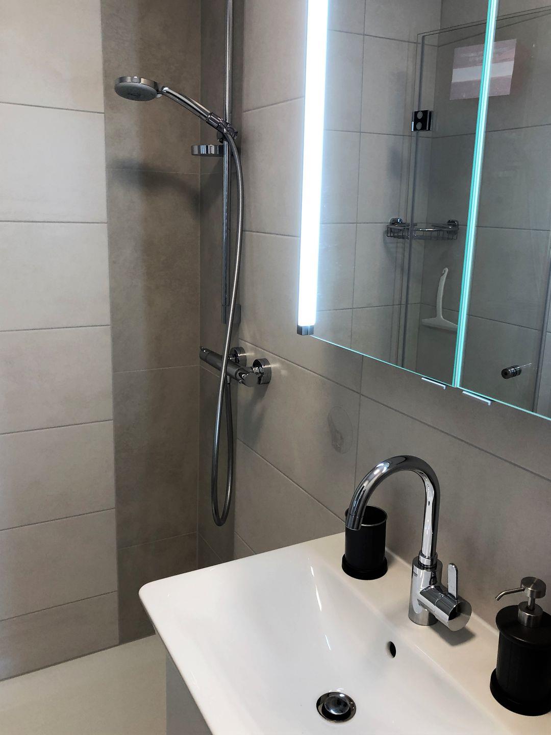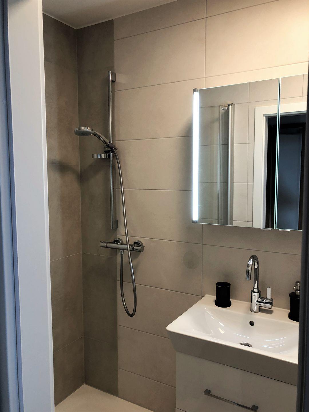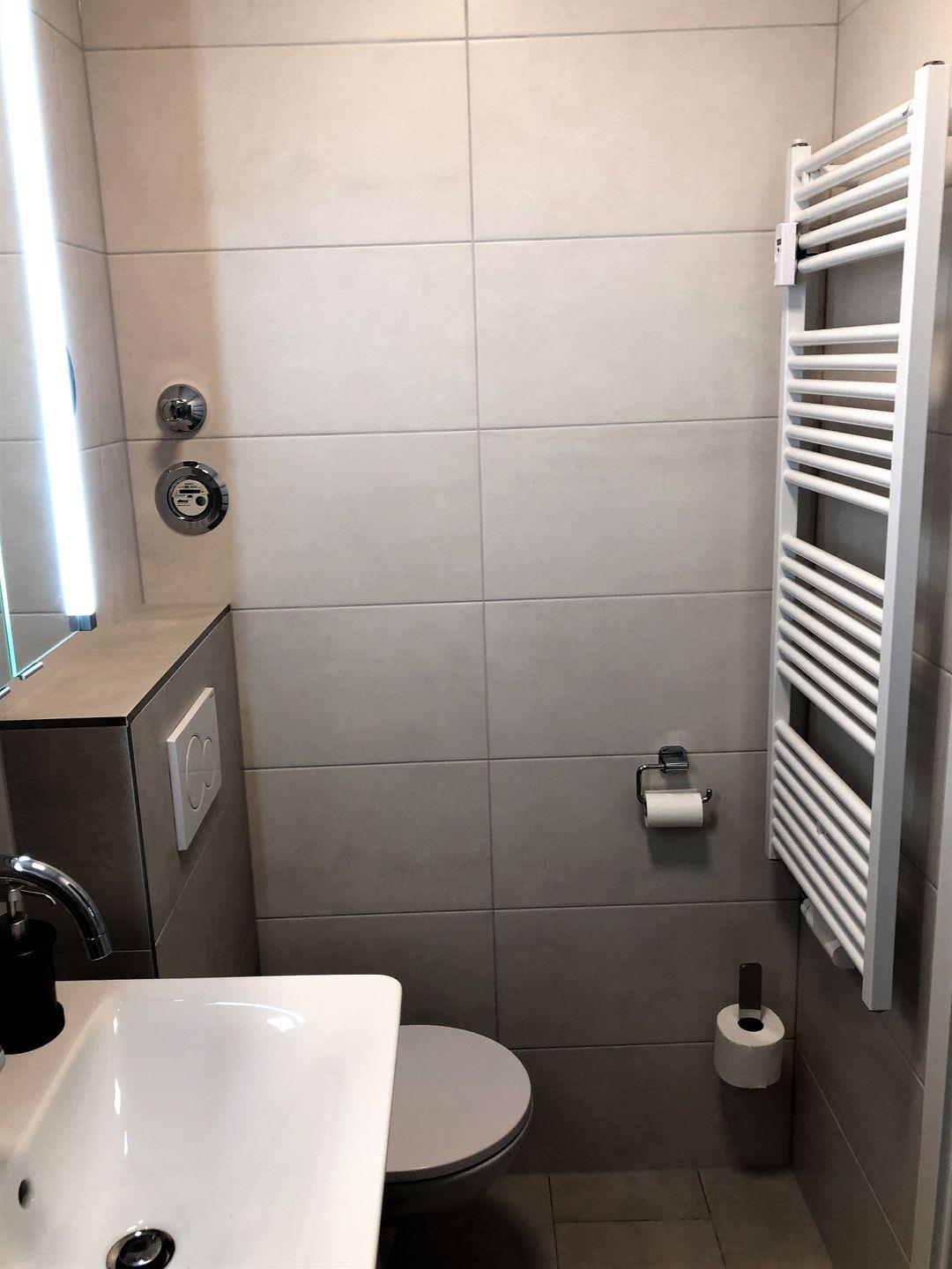 Das kleine Bad wurde 2022 hochwertig-modern in warmen Erdtönen saniert: Die große Dusche verfügt über einen extra flachen Einstieg sowie eine Glasduschwand. Ein beleuchteter Spiegelschrank, Spülbecken mit Unterschrank, Haartrockner und Handtuchheizung bieten weiteren Komfort.