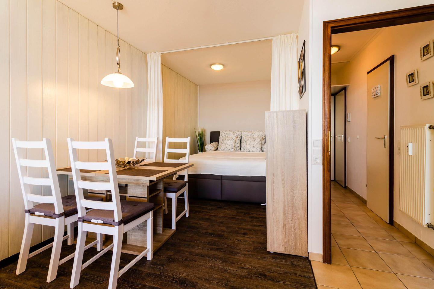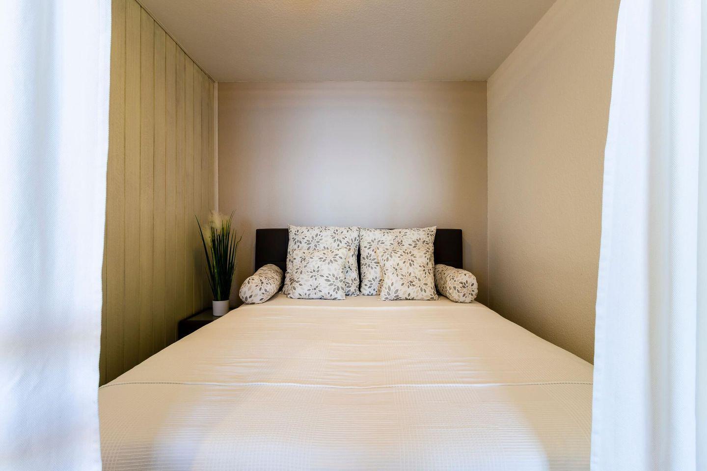 Die Wohnung bietet Ihnen ein gemütliches Doppelbett (160*200 cm) im Wohnbereich (durch einen Vorhang abgetrennt) sowie ein separates Schlafzimmer mit ausziehbarem Einzelbett (2*80*200 cm).