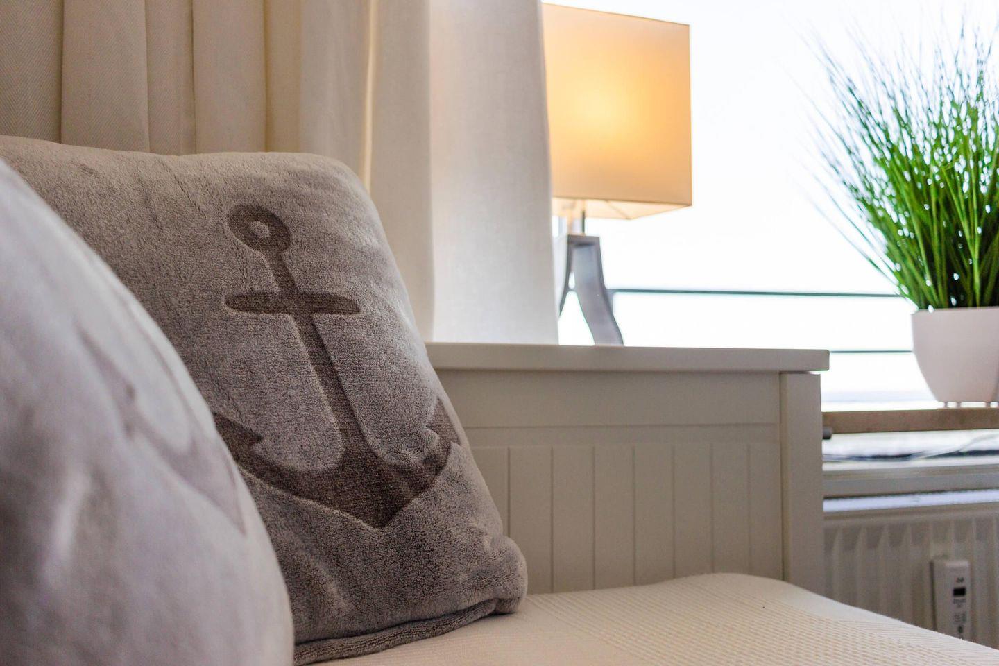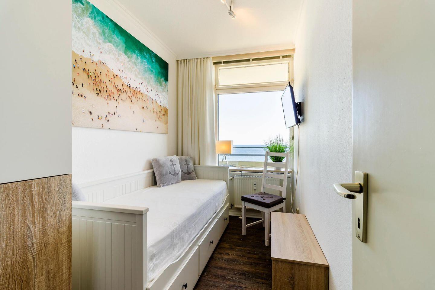 Im separaten Schlafzimmer mit Fenster befindet sich ein weiterer Flachbildfernseher. Auch von hier blicken Sie frontal auf das Meer. Das Einzelbett (80*200 cm) kann als Doppelbett (2*80*200 cm) ausgezogen werden, so dass hier ganz entspannt bis zu zwei Personen gemütliche Nächte verbringen können.