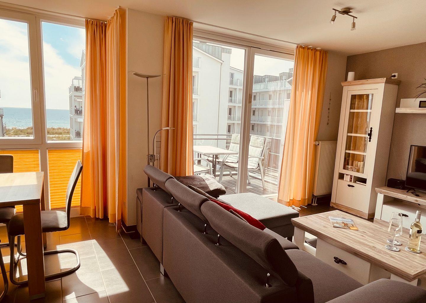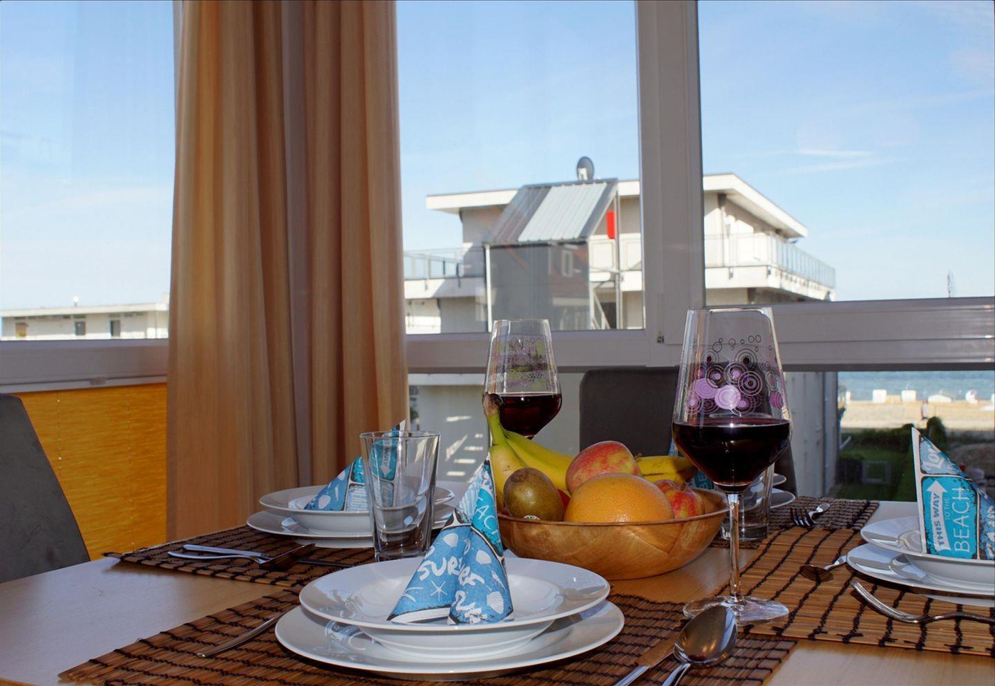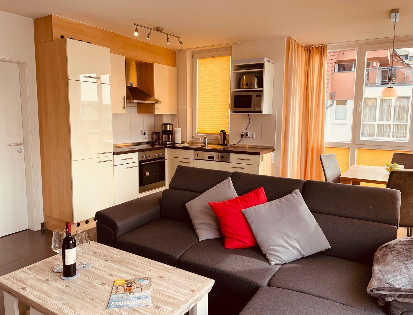 Die Wohnung empfängt Sie im Flur mit anschließendem hellen, offenen Wohn-/Koch- und Essbereich und begeistert mit großzügigen Glasfronten und einem sonnigen Südbalkon. Vom lichtdurchfluteten Essbereich können Sie den Ostseeblick aus zweiter Reihe genießen und ihre Seele baumeln lassen. Für Selbstversorger lässt die vollausgestattete, moderne Einbauküche keine Wünsche übrig.