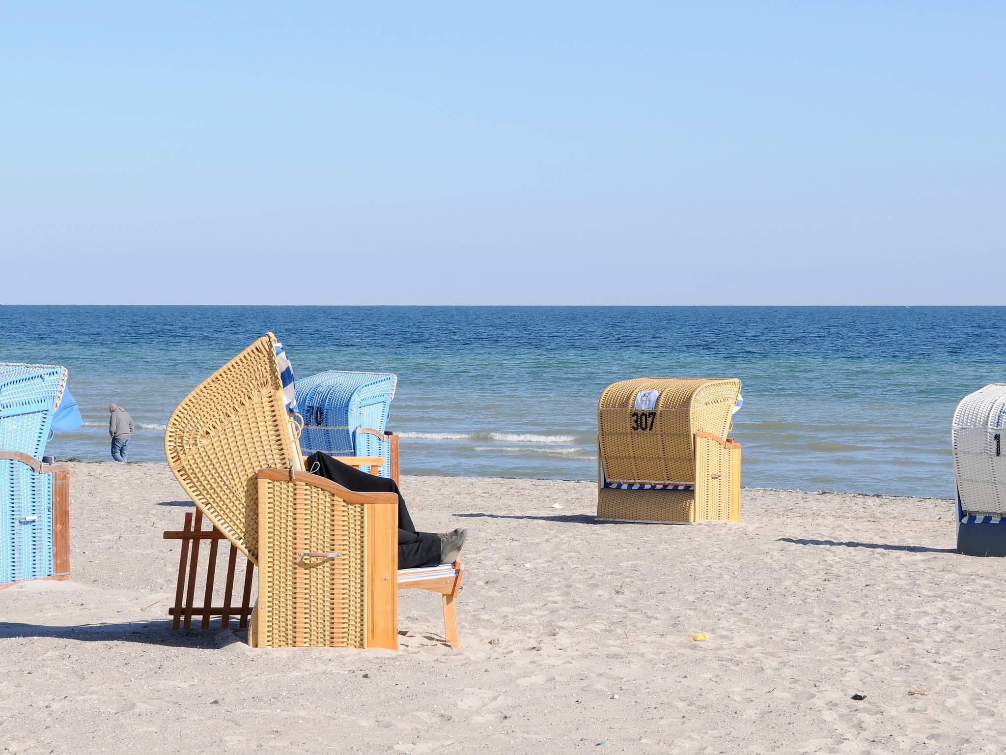 In Großenbrode finden Sie einen wunderschönen 1,5 km langen Südstrand mit weißem, feinkörnigen Sand. Genießen Sie hier sonnige Stunden im gemütlichen Strandkorb, während Sie planschenden Kinder im sanft abfallenden Wasser dabei immer im Blick haben. Außer dem herrlichen Strand zum Spielen und der Ostsee zum Planschen freuen sich Kinder über die zahlreichen Freizeitaktivitäten. Direkt neben der Seebrücke liegt das große Piratenschiff "Grobi" und auch der Minigolfplatz und die Skateanlage liegen unmittelbar am Südstrand. Für die kulinarische Pause lohnt sich ein Bummel auf der 1,5 km langen Promenade, hier finden Sie gemütliche Restaurants, leckere Imbisse, köstliche Eisdielen und verschiedene Geschäfte. Mit nur ca. 150 m zum Strand und der Promenade bietet die Wohnung einen hervorragend Ausgangspunkt für schöne Strandferien sowie Möglichkeiten, die landschaftlich reizvolle Umgebung zu erforschen. Für den Strandbesuch mit Hunden eignet sich der Weststrand, wo Sie die Möglichkeit haben, Ihren Hund an der Leine mitzuführen. Für den freien Auslauf ist eine gesonderte Fläche „Am Kai“ zur Verfügung gestellt. Nach einem aktiven Tag in der Natur und mit vielen Unternehmungen können Sie sich anschließend wunderbar in der Sauna entspannen. Ganz in der Nähe befinden sich auch die Fehmarnsundbrücke und der bekannte und beliebte Freizeitpark Hansapark.