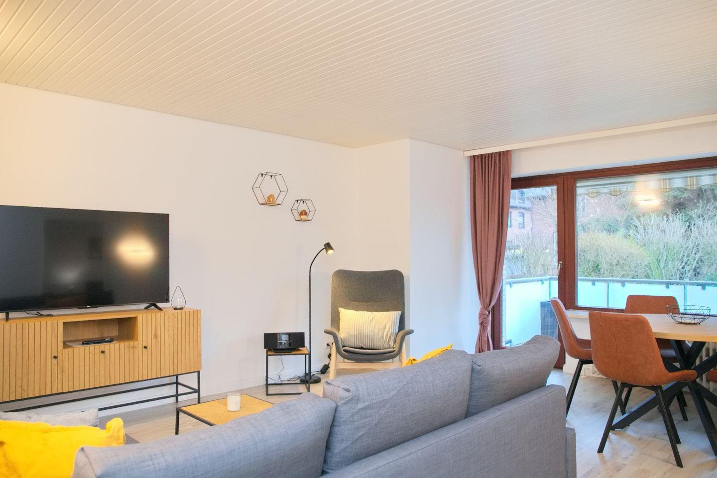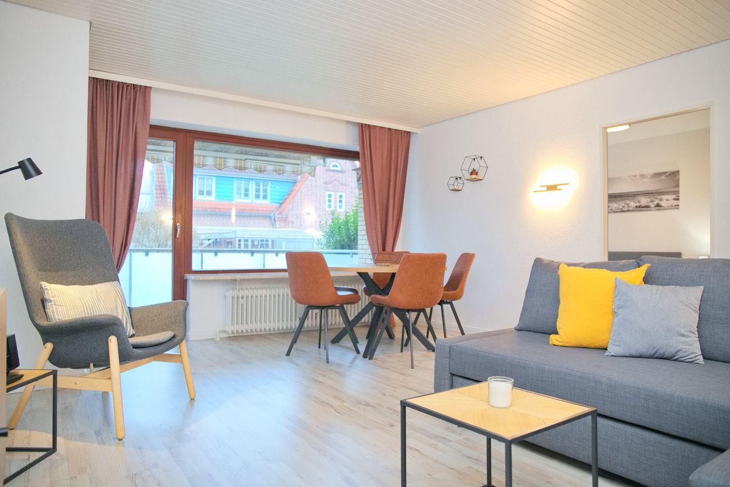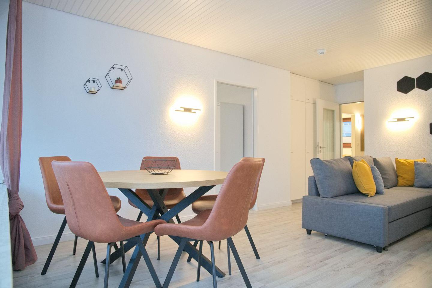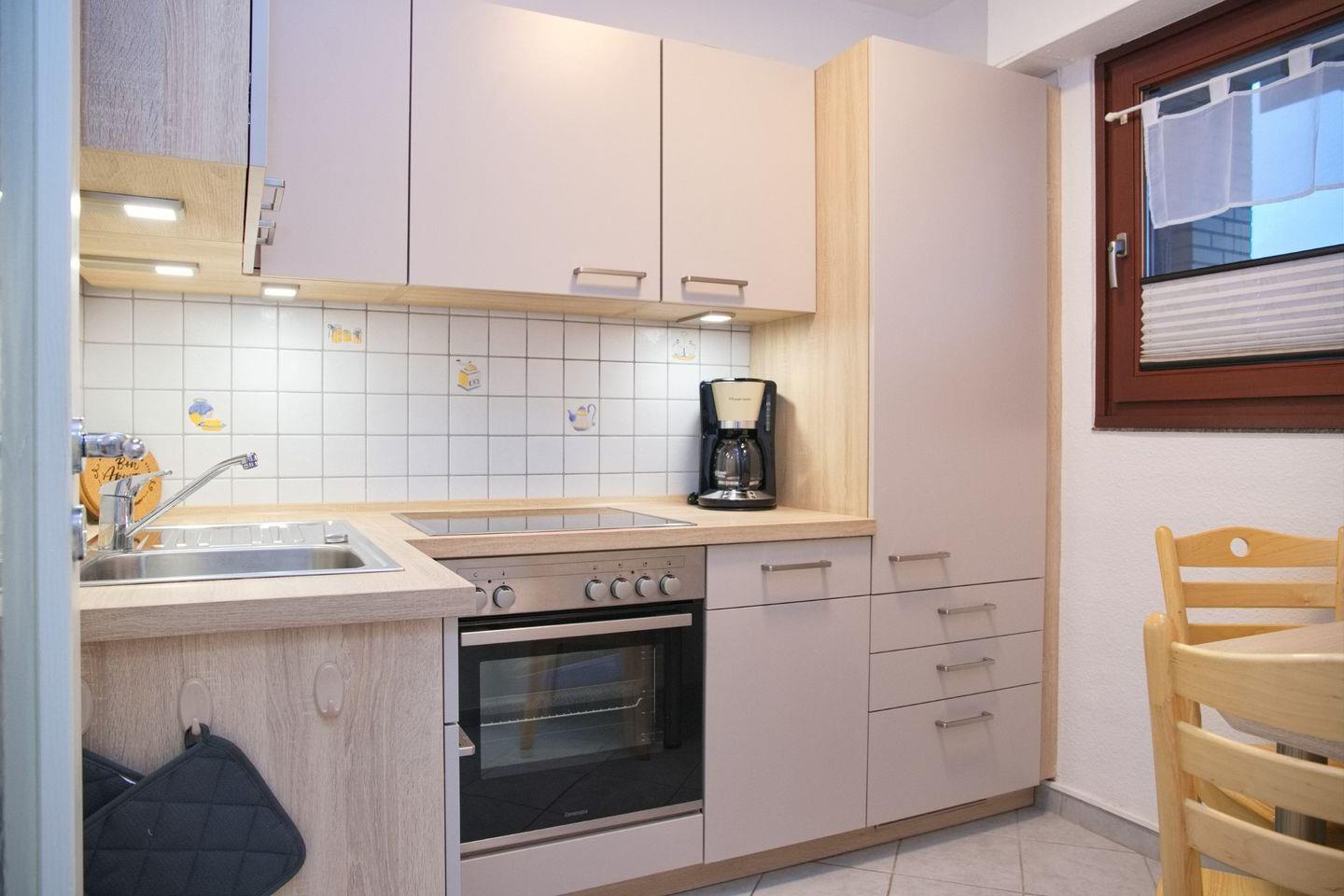Die Wohnung ist hell und freundlich gestaltet und verfügt über ein gemütliches Wohnzimmer mit Laminatboden, das zum Entspannen einlädt. Mit zwei Fernseher in der Wohnung können Sie nach einem aktiven Tag am Strand oder nach einem aufregenden Ausflug in die Umgebung auf der Couch relaxen und Ihre Lieblingssendungen genießen. Die voll ausgestattete Küche mit einem Backofen, einer Spülmaschine sowie Geschirr und Besteck lässt keine Wünsche offen. Ob Sie eine schnelle Mahlzeit zubereiten oder ein ausgedehntes Abendessen mit Ihren Liebsten genießen möchten, hier sind Sie bestens versorgt.
