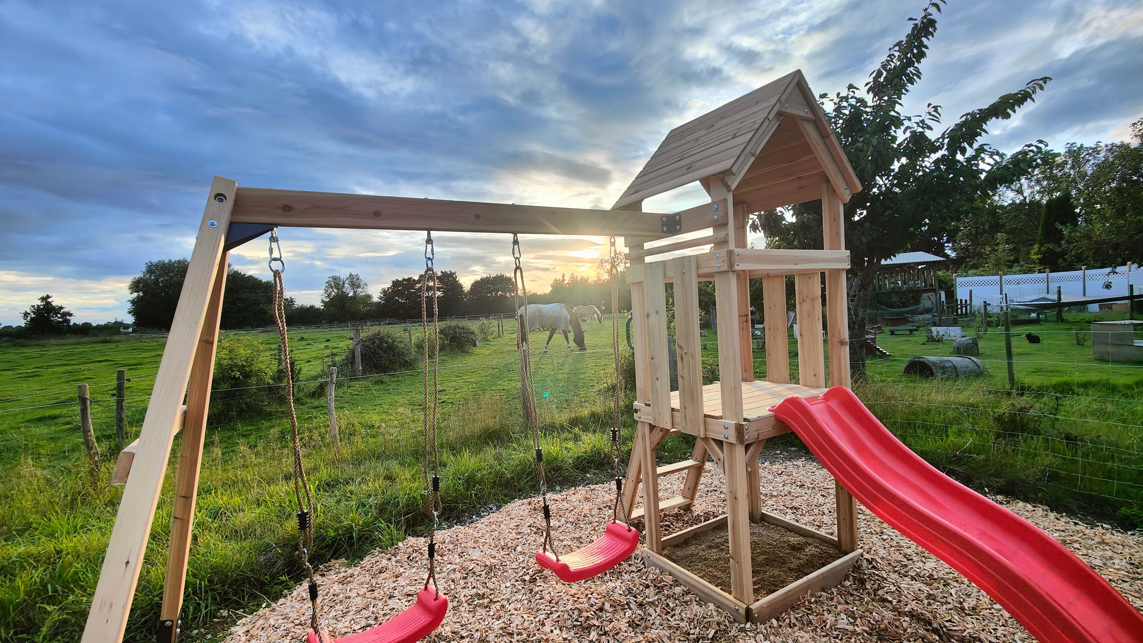 Flur, Essbereich, Duschbad, Badezimmer, Wohn-/Esszimmer mit offener Küche, Sofaecke, TV und Zugang zur Terrasse mit großen Garten und Spieleturm. Schlafzimmer 1 mit Doppelbett (2x90x200), Plissees, Kleiderschrank und Nachttischleuchten. Schlafzimmer 2 mit Etagenbett (90x200) und einem Einzelbett (90x200), Plissees und Nachttischleuchten.