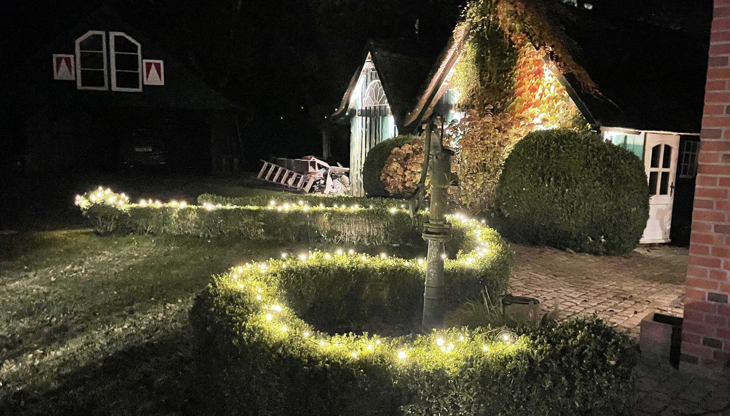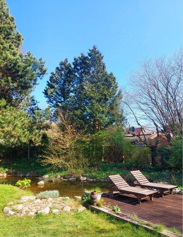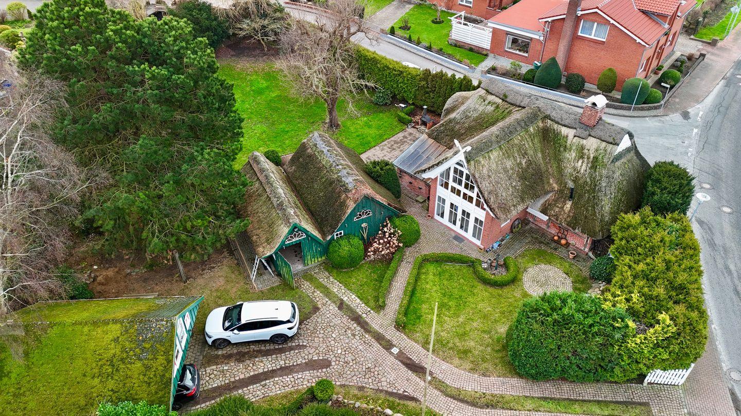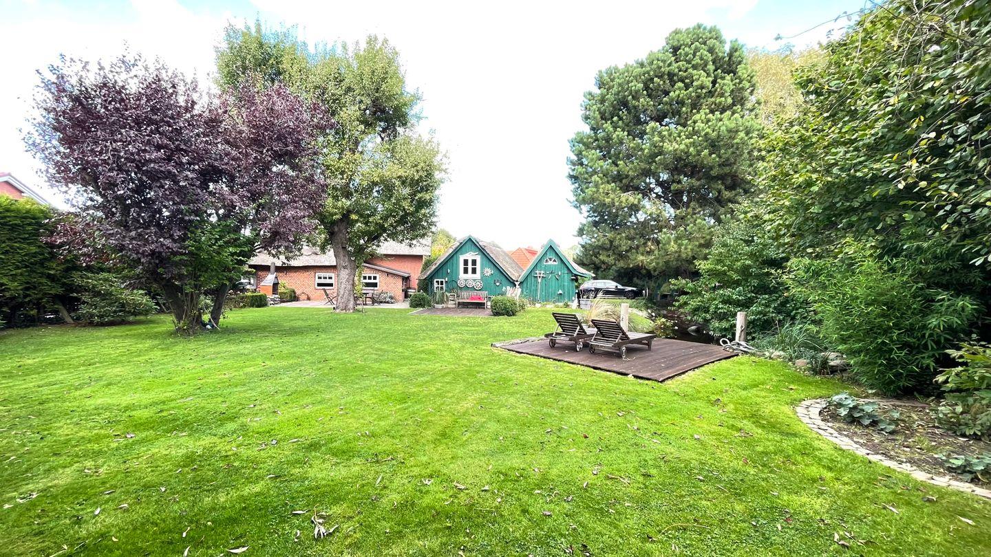 Der großzügige Gartenbereich bietet zu jeder Tageszeit Sitzgelegenheiten auf den 4 Terrassen, um die Sonne zu genießen. Der kleine, idyllische Gartenteich mit einer Wassertiefe von bis zu 50 cm ( nicht eingezäunt) fügt sich harmonisch in das Rasengrundstück ein. Gartenliegen laden zum Verweilen ein. Im reetgedeckten Außengebäude stehen Ihnen zusätzliche, abschließbare Abstellmöglichkeiten für Fahrräder usw. zur Verfügung. Ihre Autos dürfen Sie im Carport sicher unterstellen.