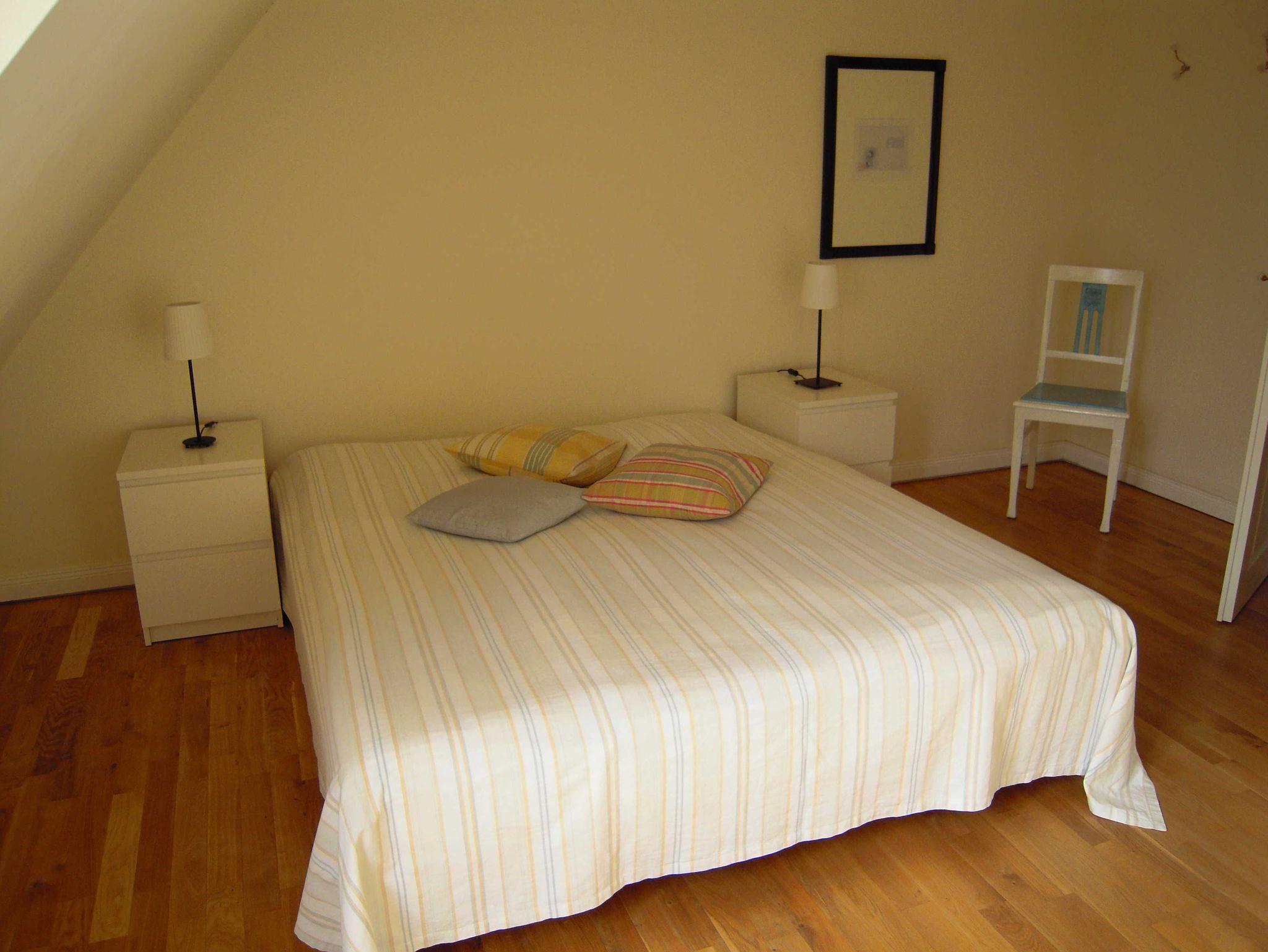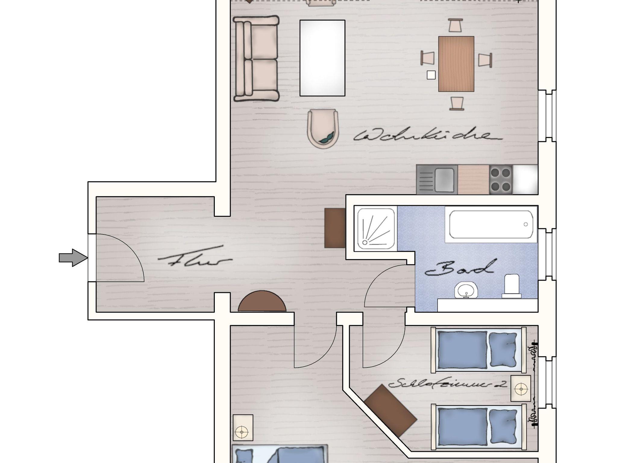 Die Ferienwohnung Nr. 5 befindet sich im zweiten Obergeschoss des Gutshauses. Die Wohnung für bis zu vier Personen und in einer Größe von 69 m² ist stilvoll eingerichtet und besteht aus drei Zimmern: Ein großes Wohnzimmer mit offener Küche (hochwertige Siemens-Geräte) und schönem Blick auf den Garten und das Wasser, ein Schlafzimmer mit zwei Einzelbetten und ein Schlafzimmer mit einem Doppelbett und ein Badezimmer mit separater Badewanne und Dusche. Die Böden der Ferienwohnung bestehen aus Eichen-Parkett.