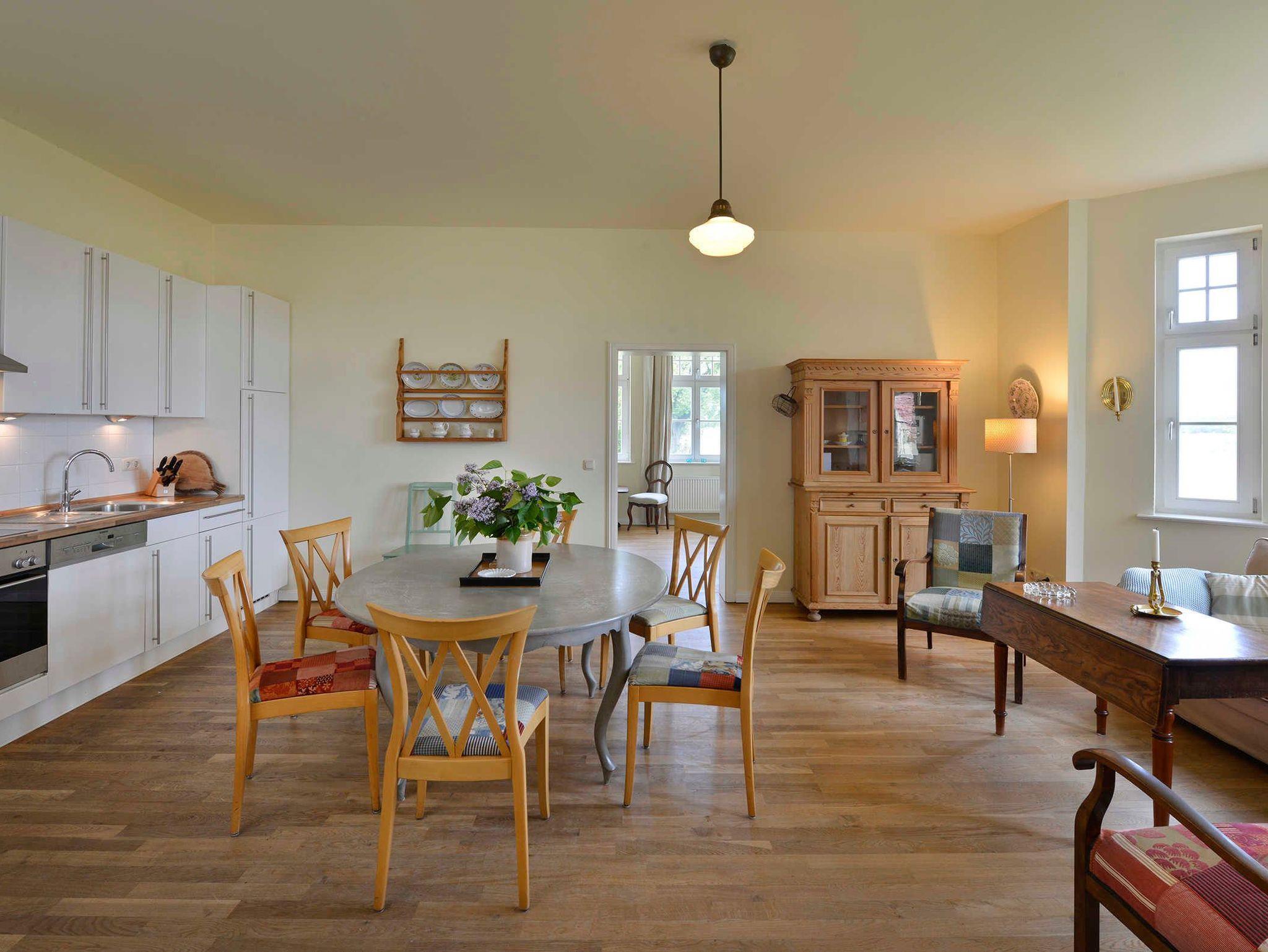 Ferienwohnung 3 im Gut Grubnow auf Rügen bietet Seeblick, Terrasse und hochwertigen Komfort in idyllischer Lage.