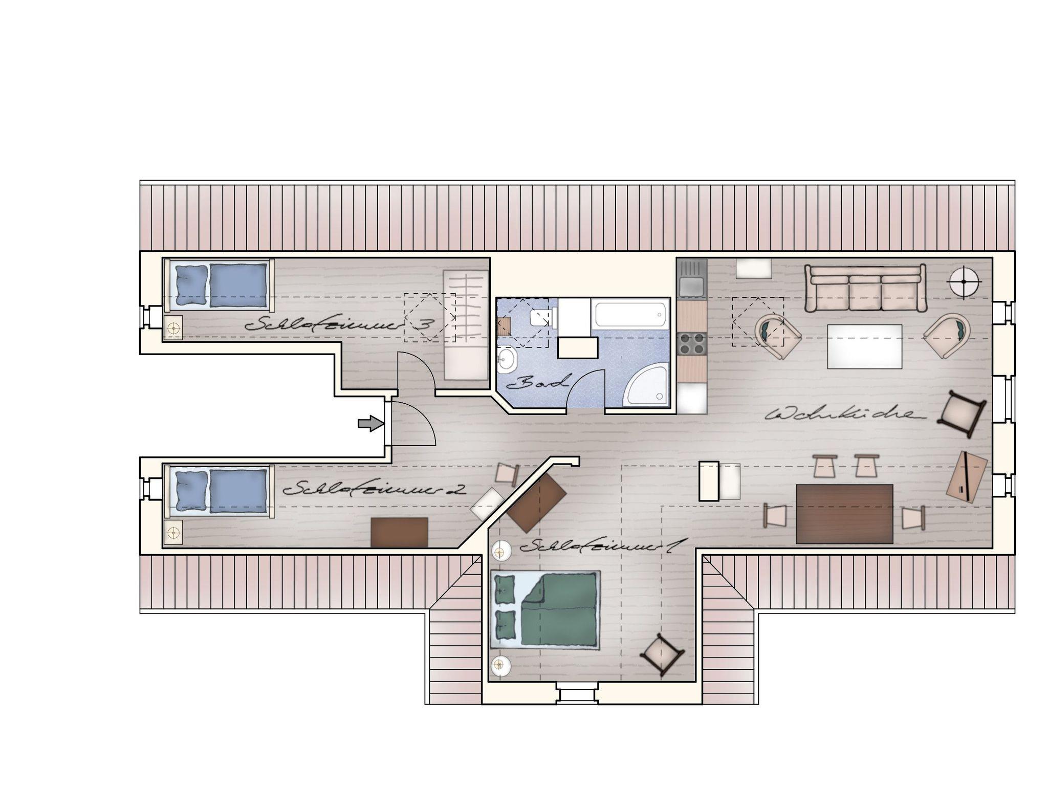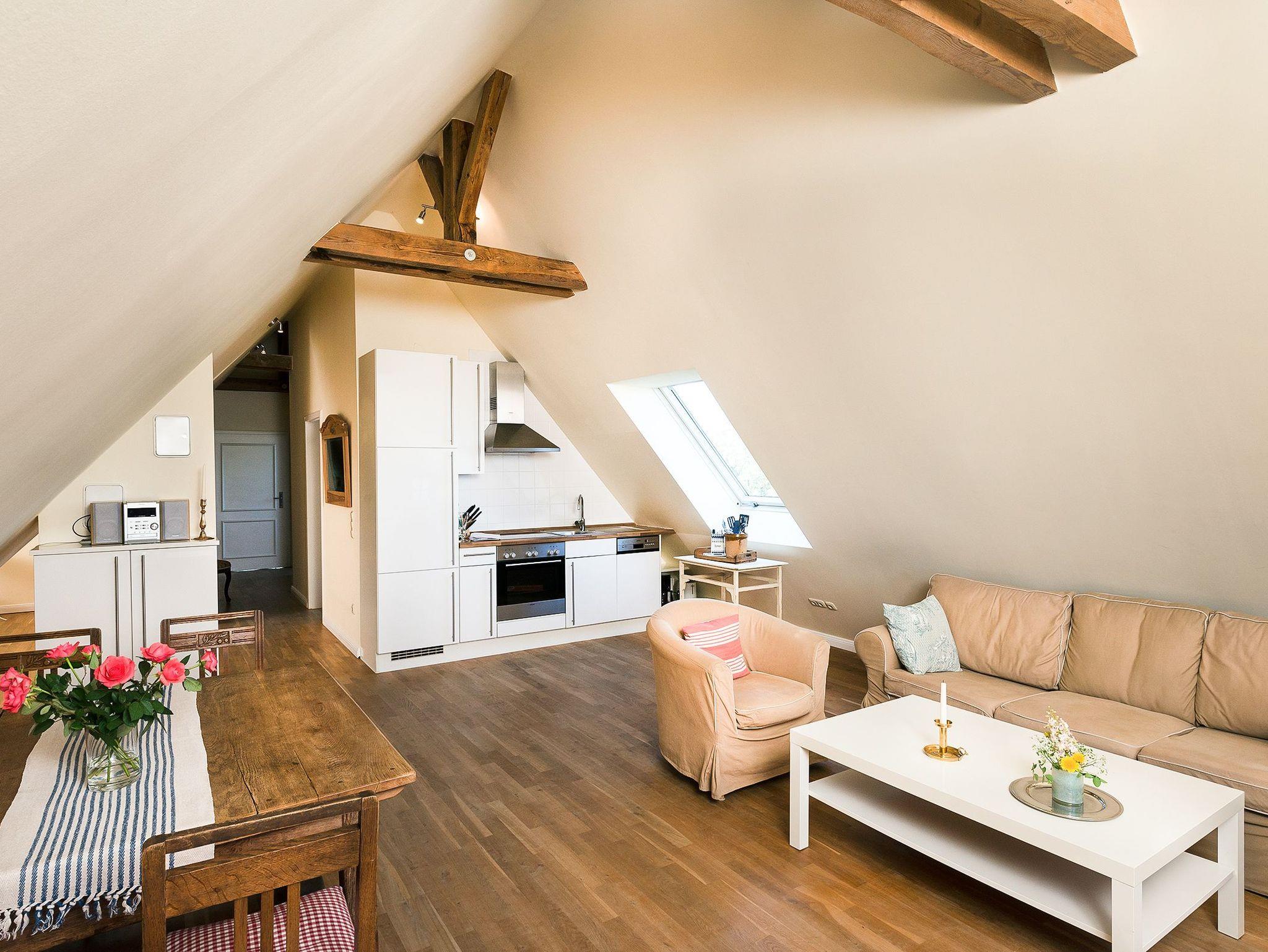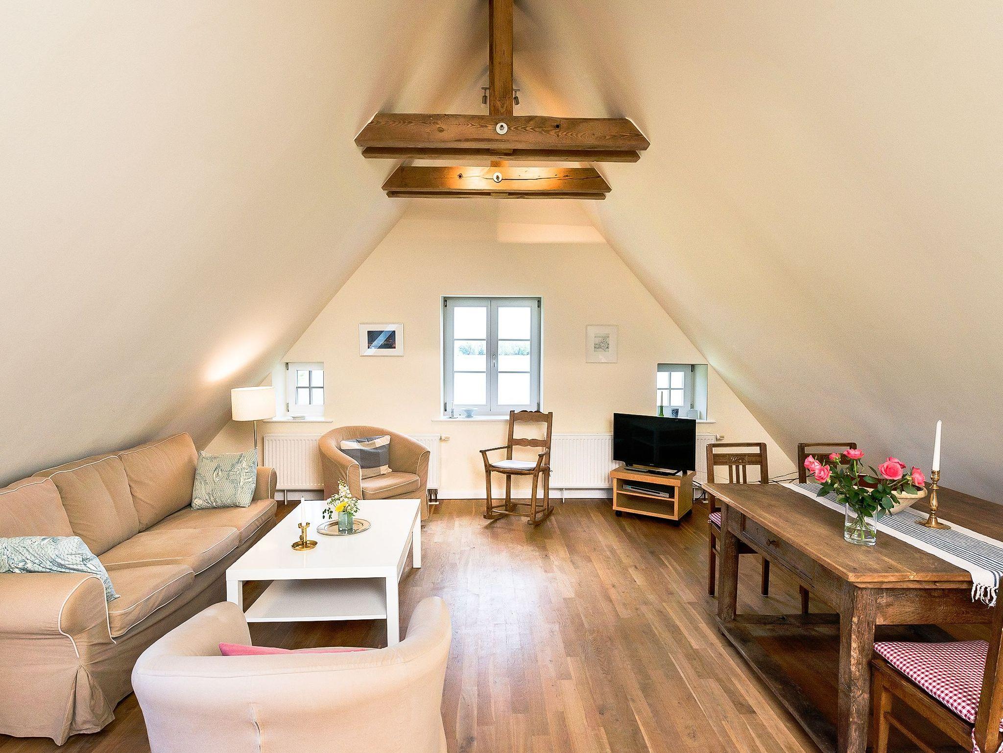 Die Ferienwohnung Nr. 8 befindet sich im äußerst gemütlichen Dachgeschoss des Gutshauses. Die Wohnung für bis zu vier Personen und in einer Größe von 78 m² ist gemütlich und mit Liebe zum Detail eingerichtet und besteht aus drei Zimmern: Ein großes Wohnzimmer mit offener Küche (Siemens-Geräte) und schönem Blick auf den Garten und das Wasser, ein Schlafzimmer mit zwei Einzelbetten und ein Schlafzimmer mit einem Doppelbett (offene Raumgestalgung, ohne Tür, siehe Fotos) und ein Badezimmer mit separater Badewanne und Dusche. Die Böden der Ferienwohnung bestehen aus Eichen-Parkett.