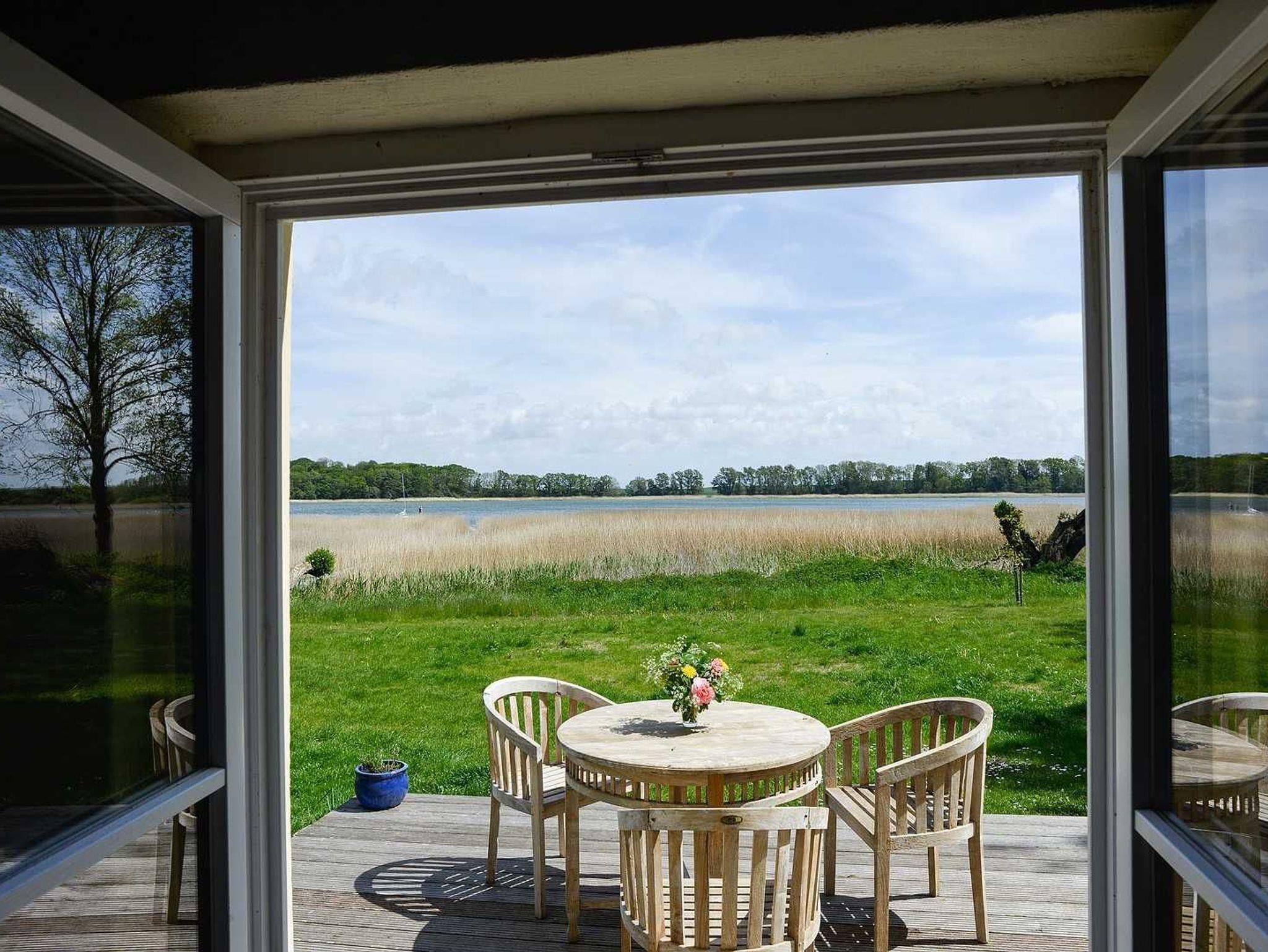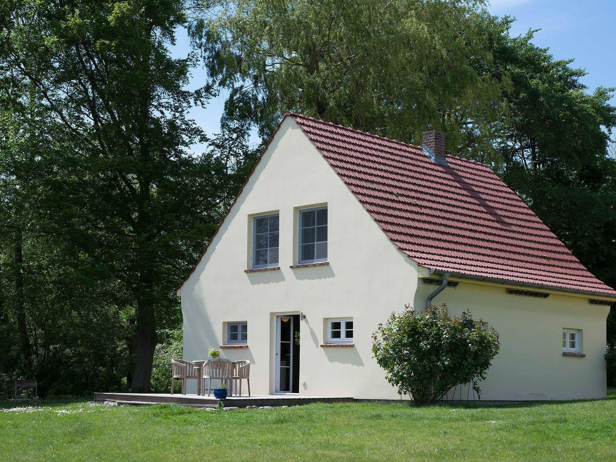 Gemütliches Ferienhaus Remise auf Gut Grubnow mit Seeblick, großer Terrasse und Sauna für erholsame Tage.
