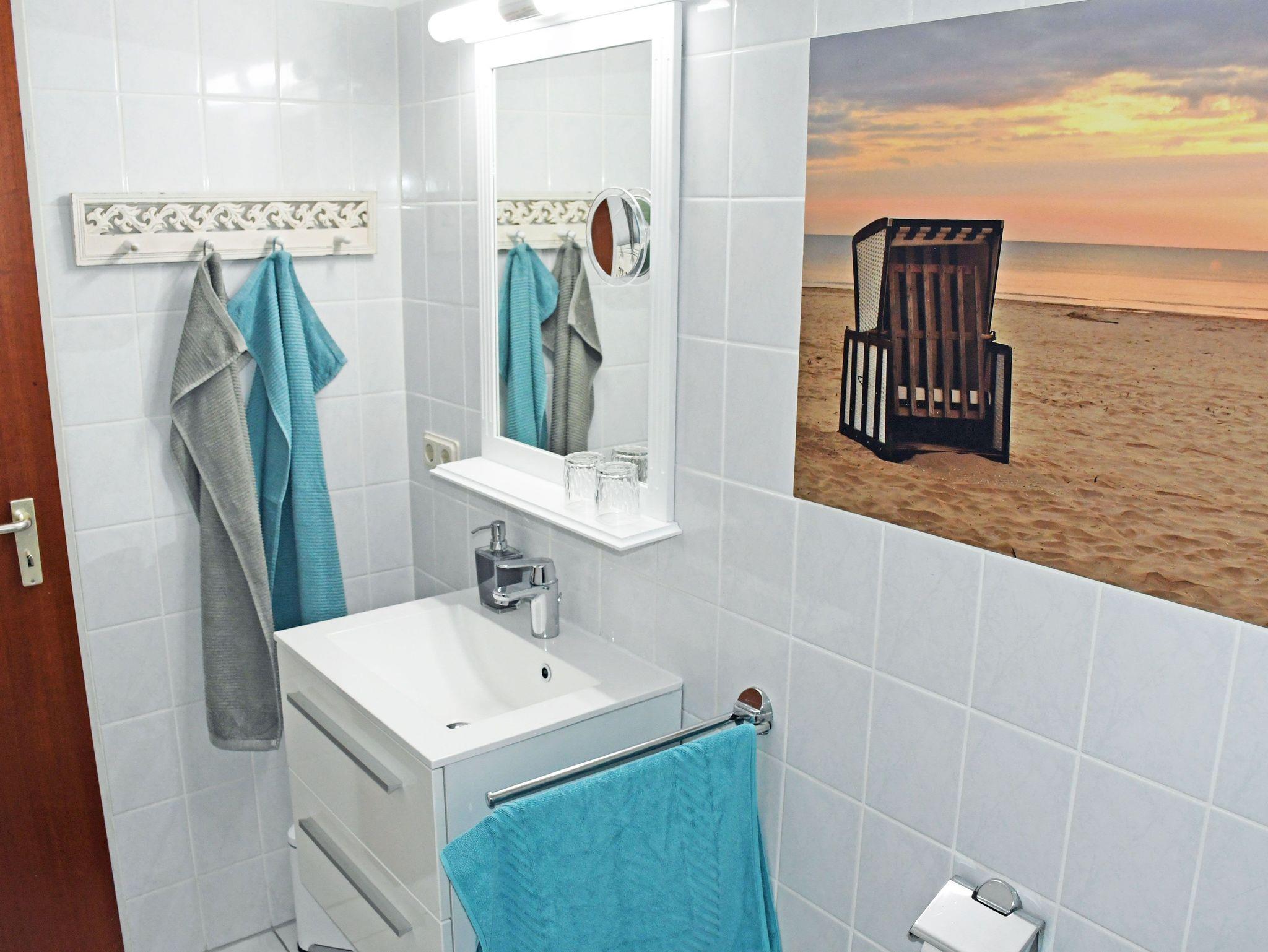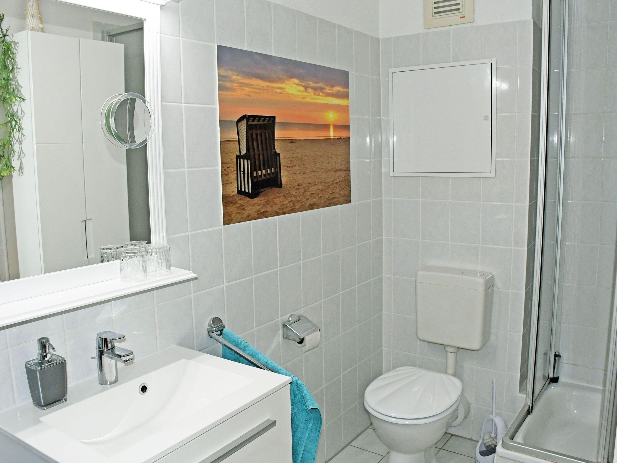 Das Bad, ist mitDusche, WC, Fön und Waschtisch ausgestattet.