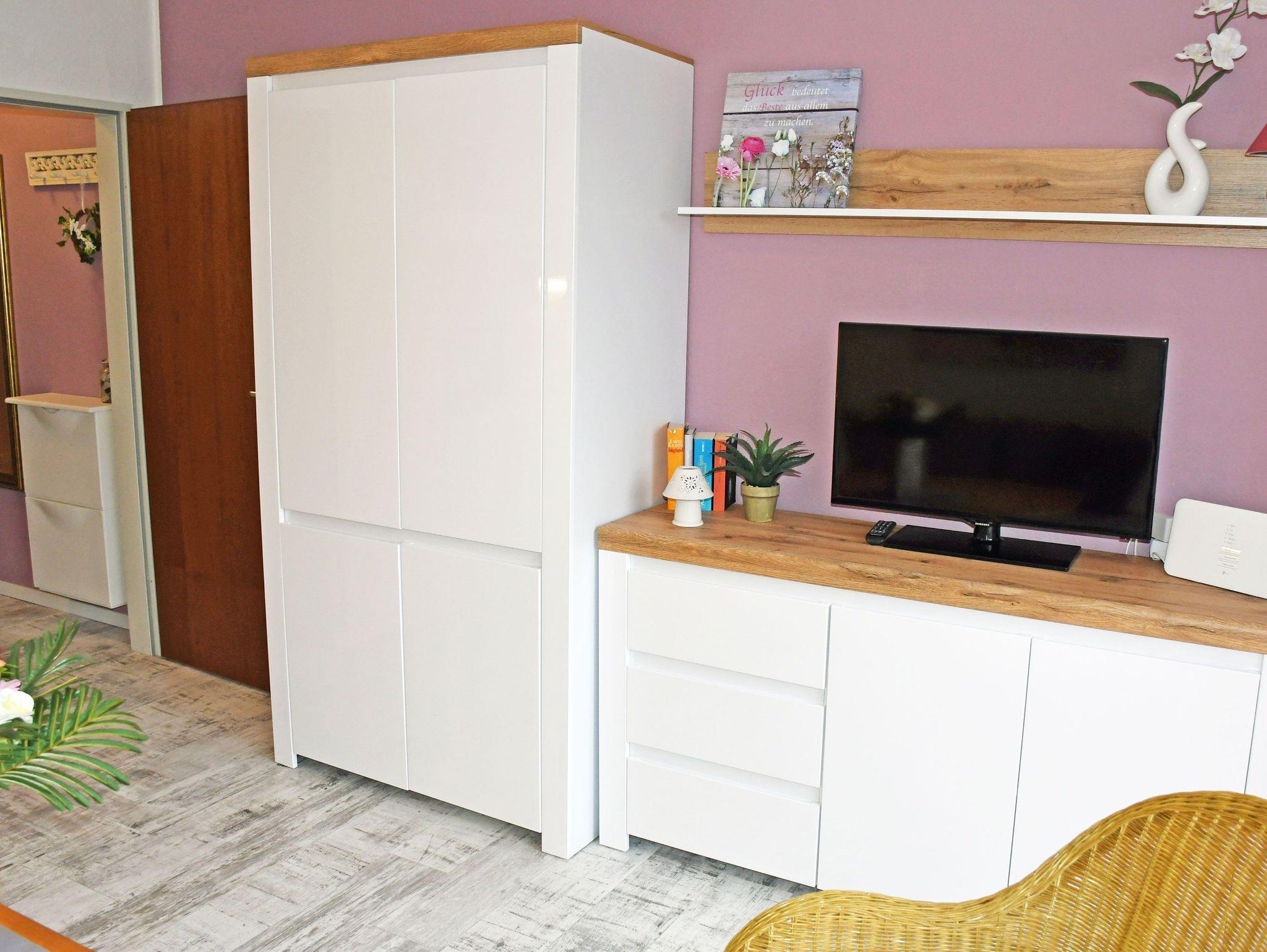 Unsere schöne, helle und liebevoll eingerichtete Ferienwohnung Johanna (separater Eingang, 26 qm, 1 komb. Wohn- und Schlafraum, Küchenzeile, Dusche/WC, WLAN-Internet, Terrasse, max. 2 erwachsene Gäste und ein Kind im Kinderreisebett bis 3 J., befindet sich in ruhiger Lage in Gustow. Die Wohnung befindet sich im Erdgeschoss eines Appartementhauses.