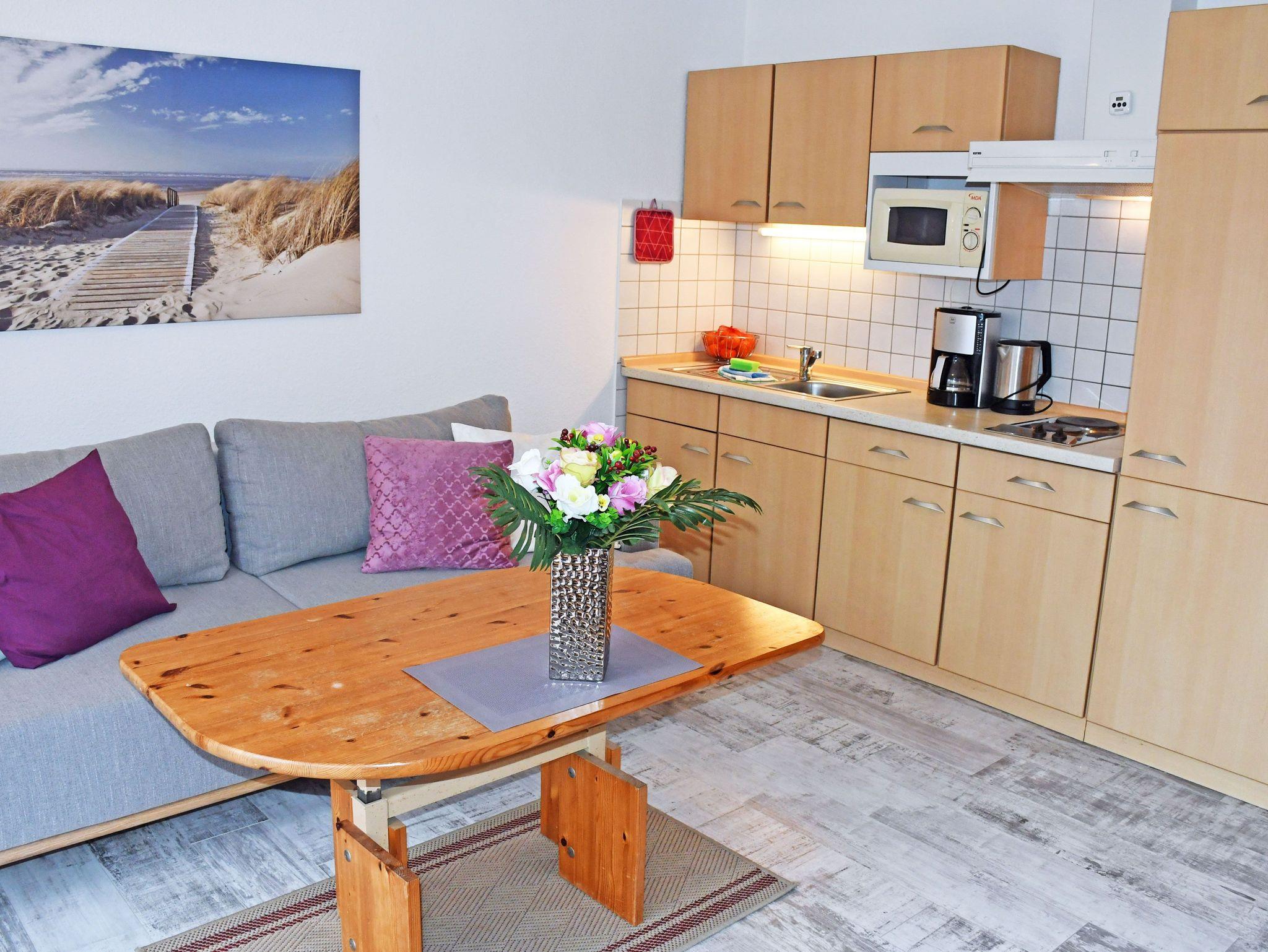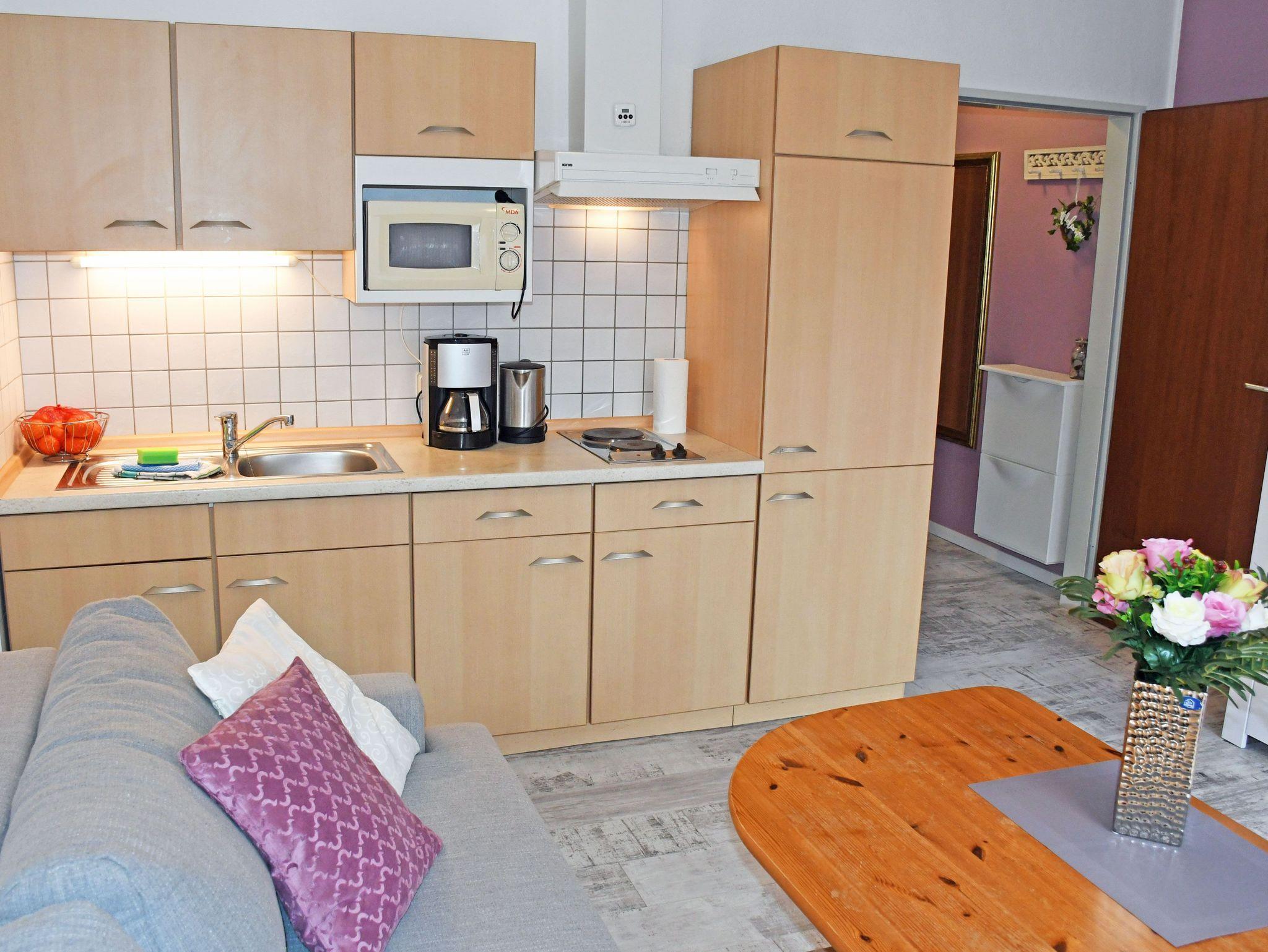 Die moderne Küchenzeile ist mit Elektroherd und Mikrowelle, Kühlschrank, Abzugshaube, Kaffeemaschine, Wasserkocher, Toaster und vieles mehr komplett ausgestattet.