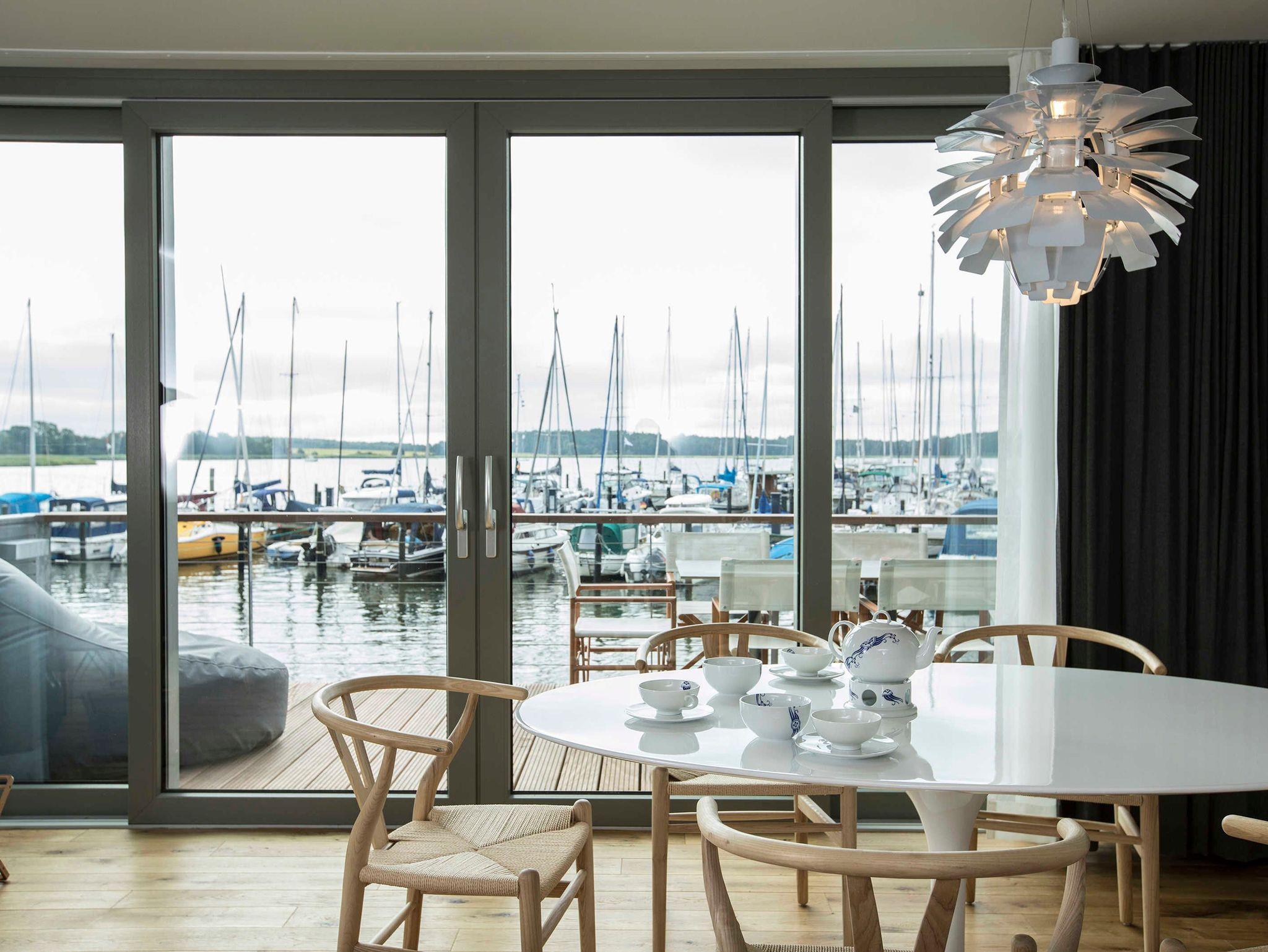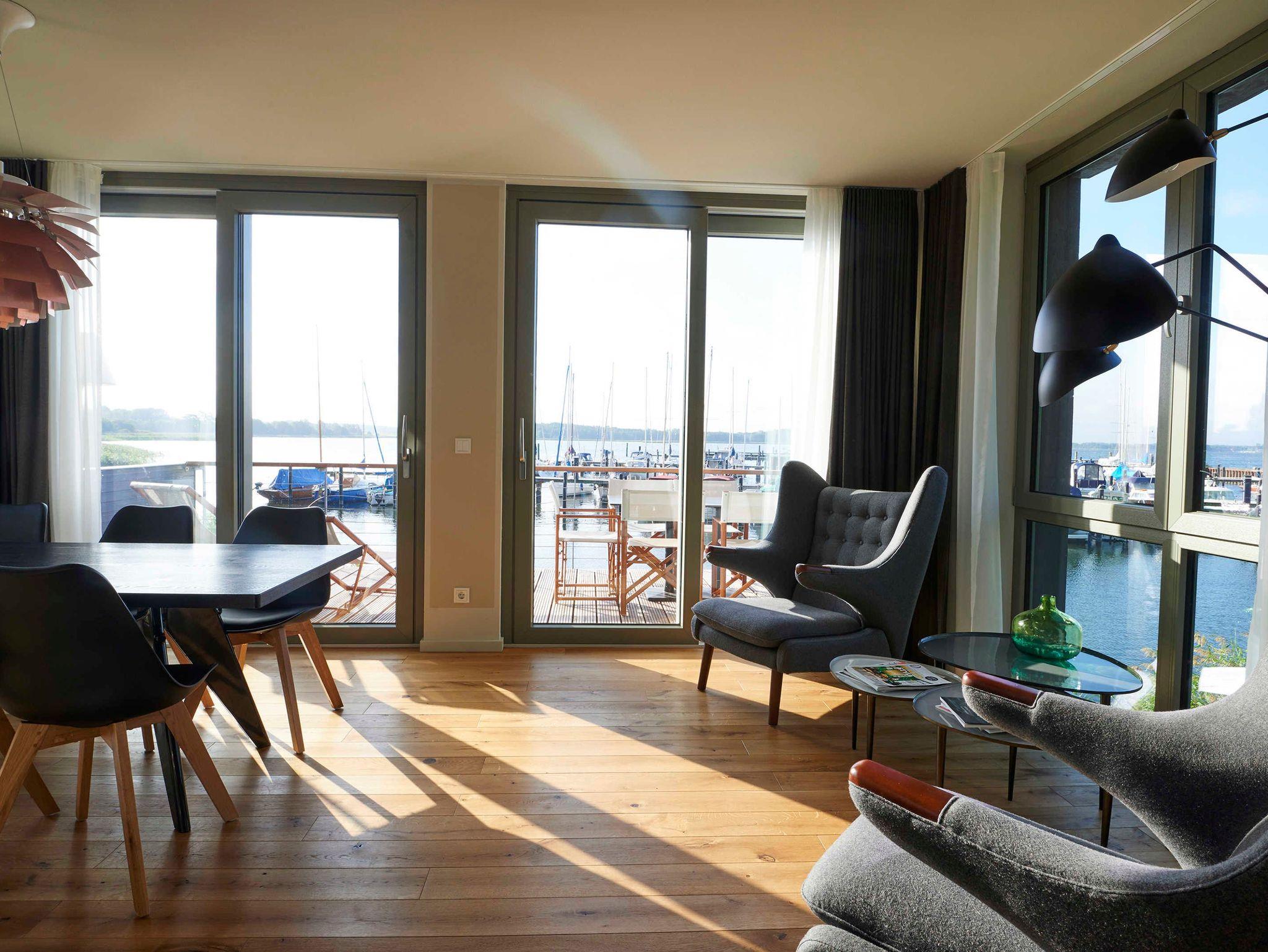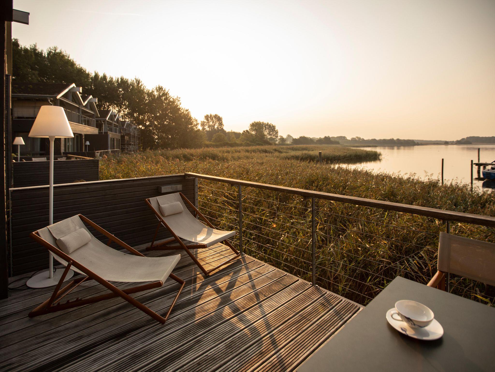 Unsere Uferhäuser bieten höchsten Komfort und traumhafte Ausblicke. Natürliche Materialien wie Holz und Naturstein kombiniert mit Designklassikern des 20. Jahrhunderts bestimmen das Ambiente. Wir haben uns wirklich viel Mühe gegeben mit der Gestaltung und sind begeistert vom Ergebnis.