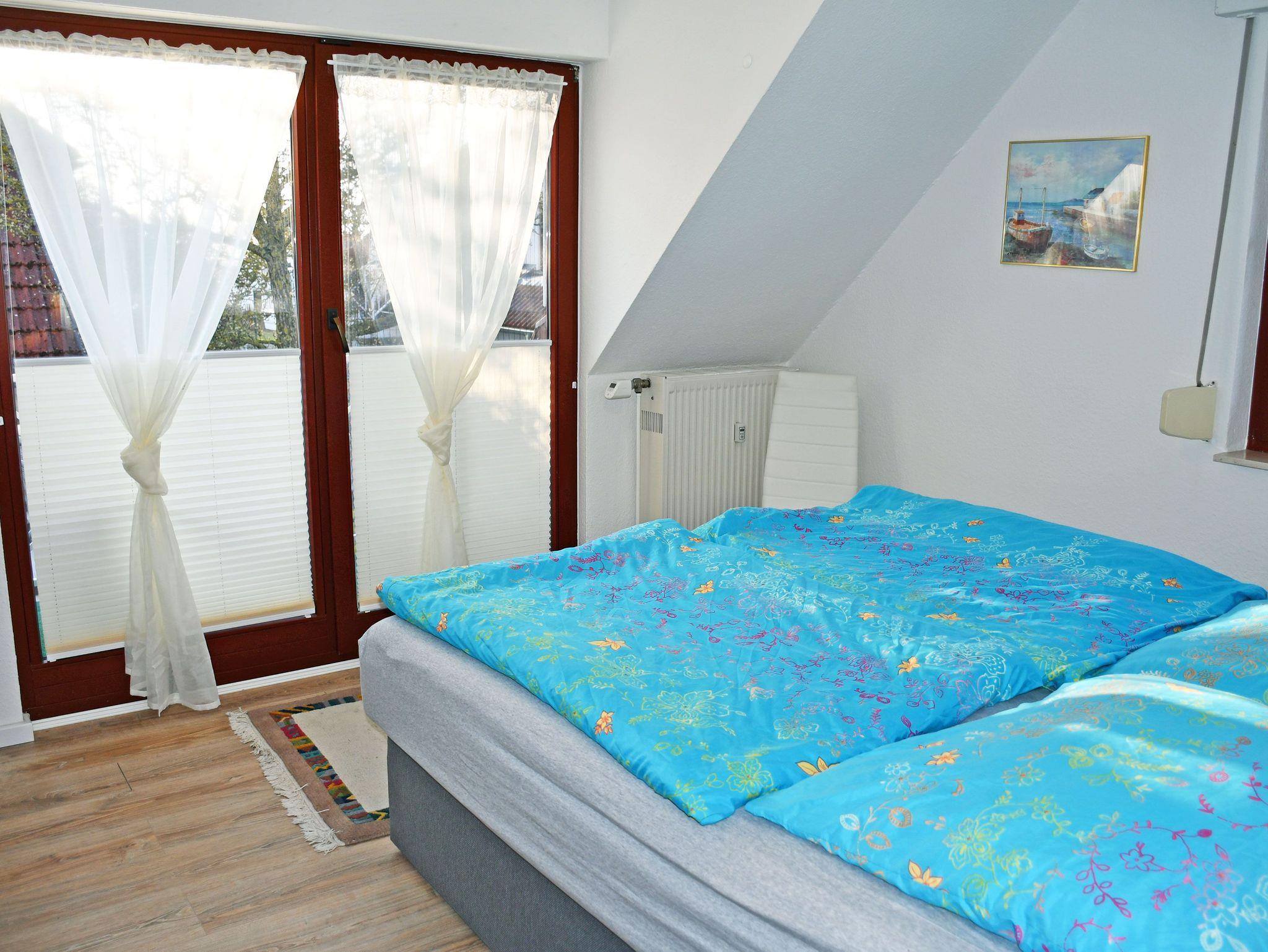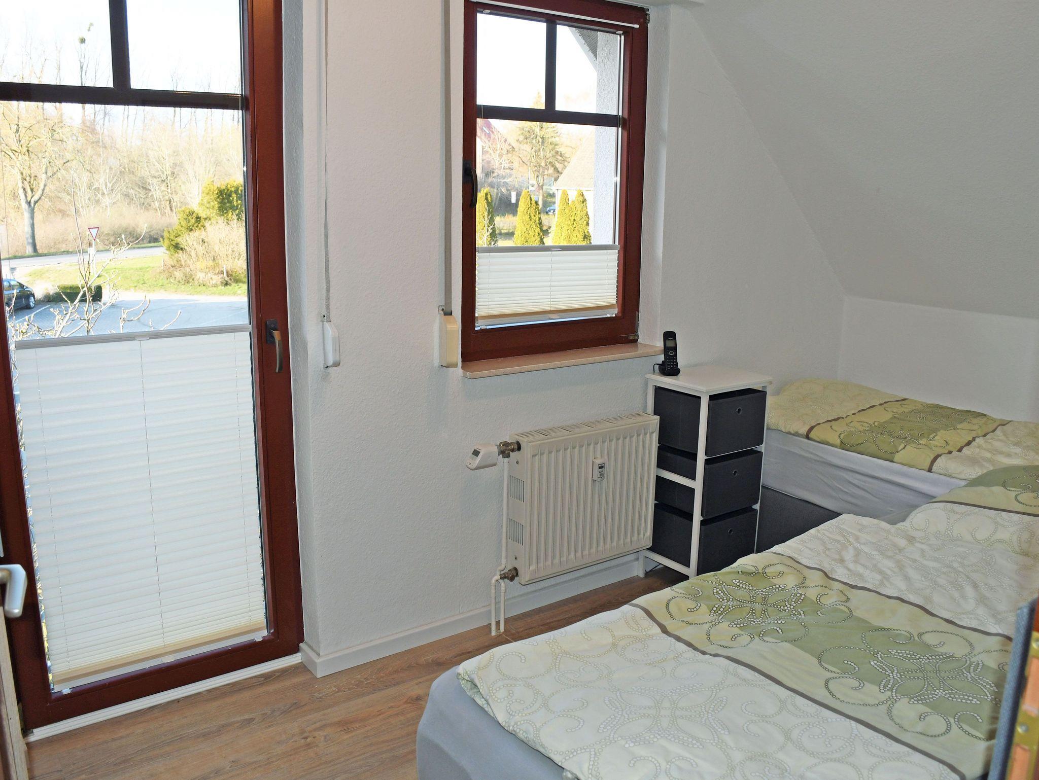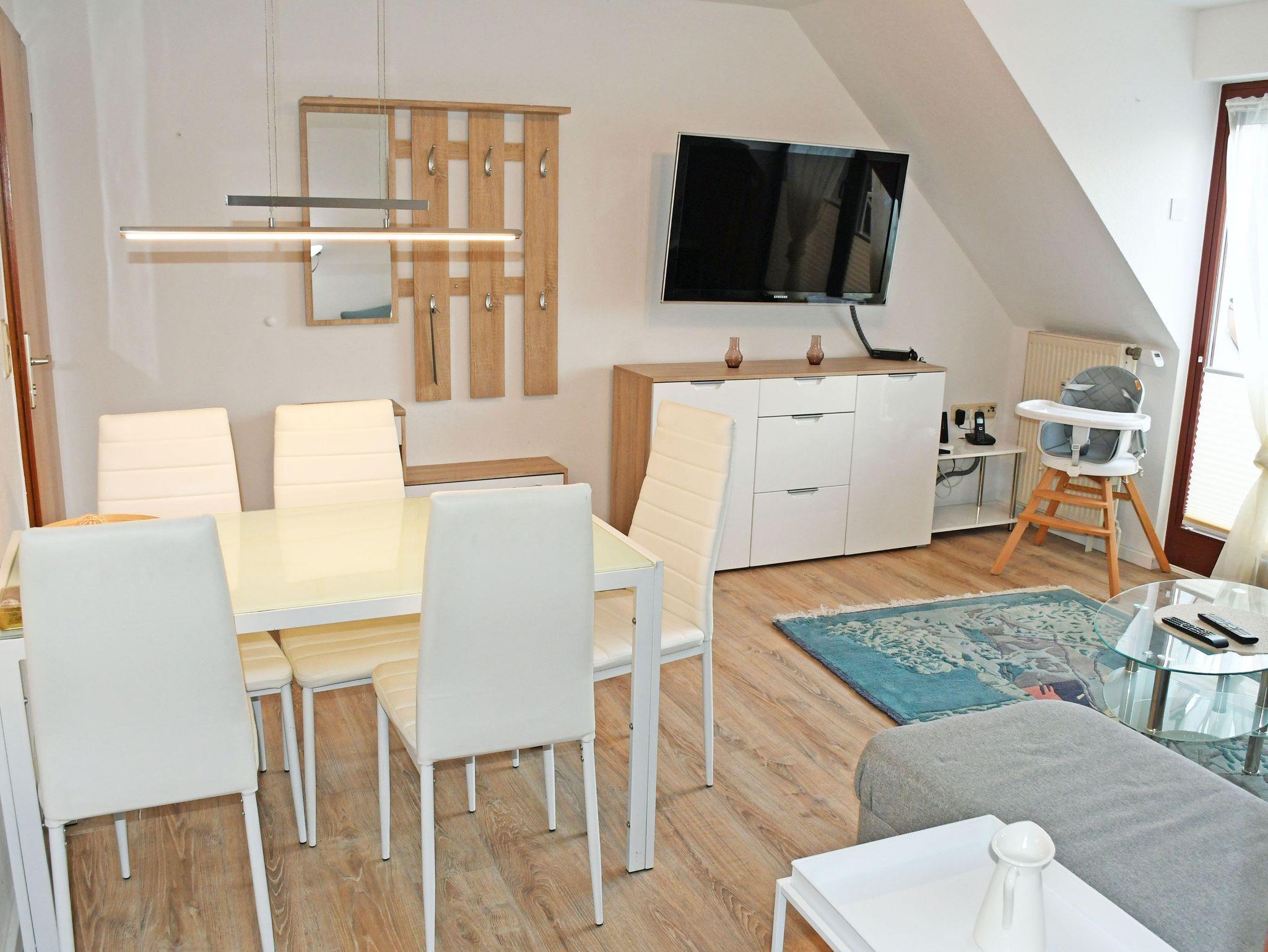 Die Unterkunft im 1. OG bietet auf ca.60qm einen Wohn-/Essbereich mit einem kleinen Eingangsbereich mit Garderobe sowie 2 Balkone (Westseite). In der angrenzenden Küche mit guter Ausstattung können Sie für leibliches Wohl sorgen. Ein kleiner Flur führt zum Tageslichtbad mit Dusche sowie ins Schlafzimmer mit einem gemütlichen Doppelbett, Schrank und einem kleinen Balkon (Westseite). Außerdem gelangen Sie ins zweite Schlafzimmer mit zwei Einzelbetten sowie französischem Balkon.