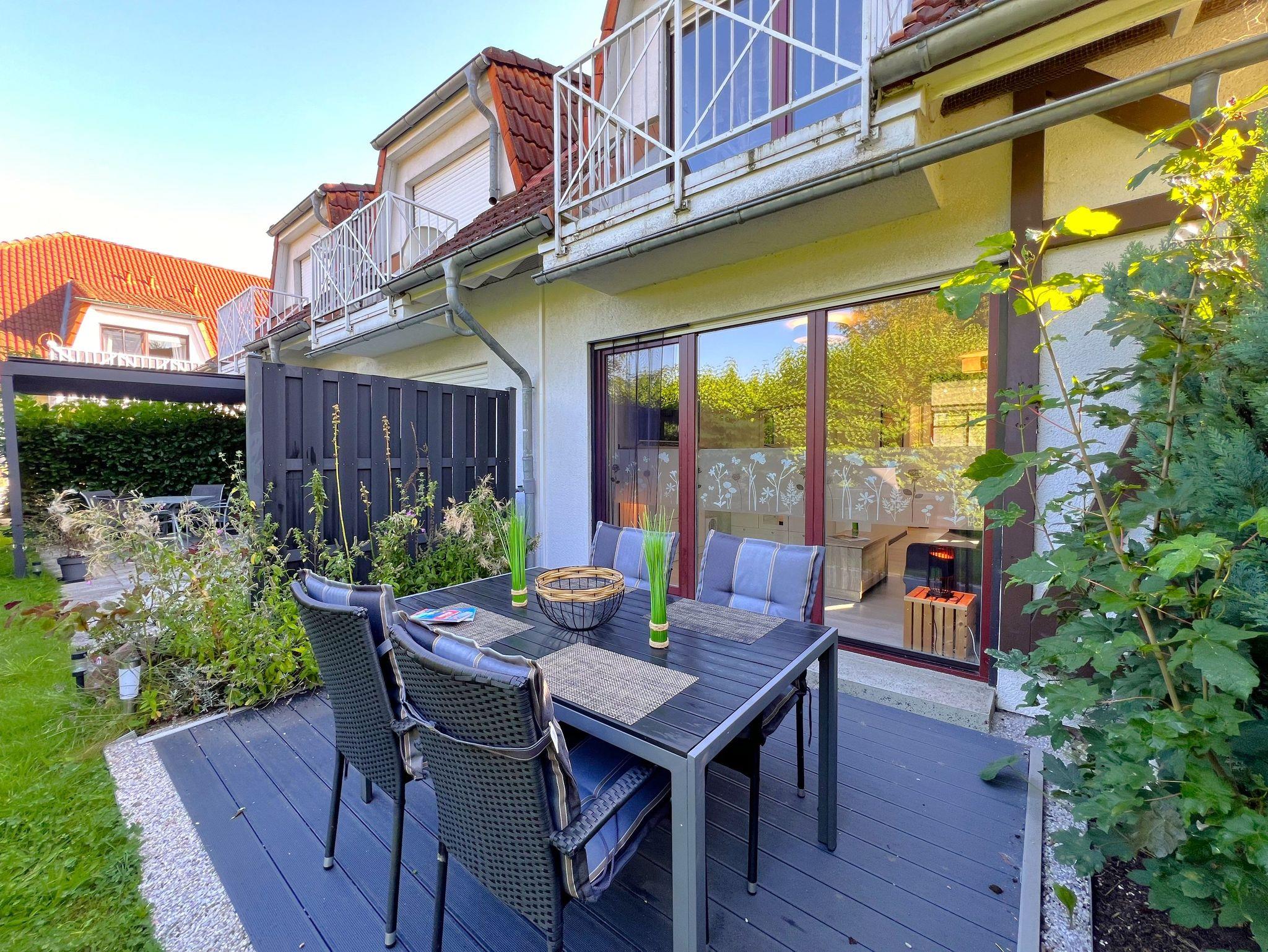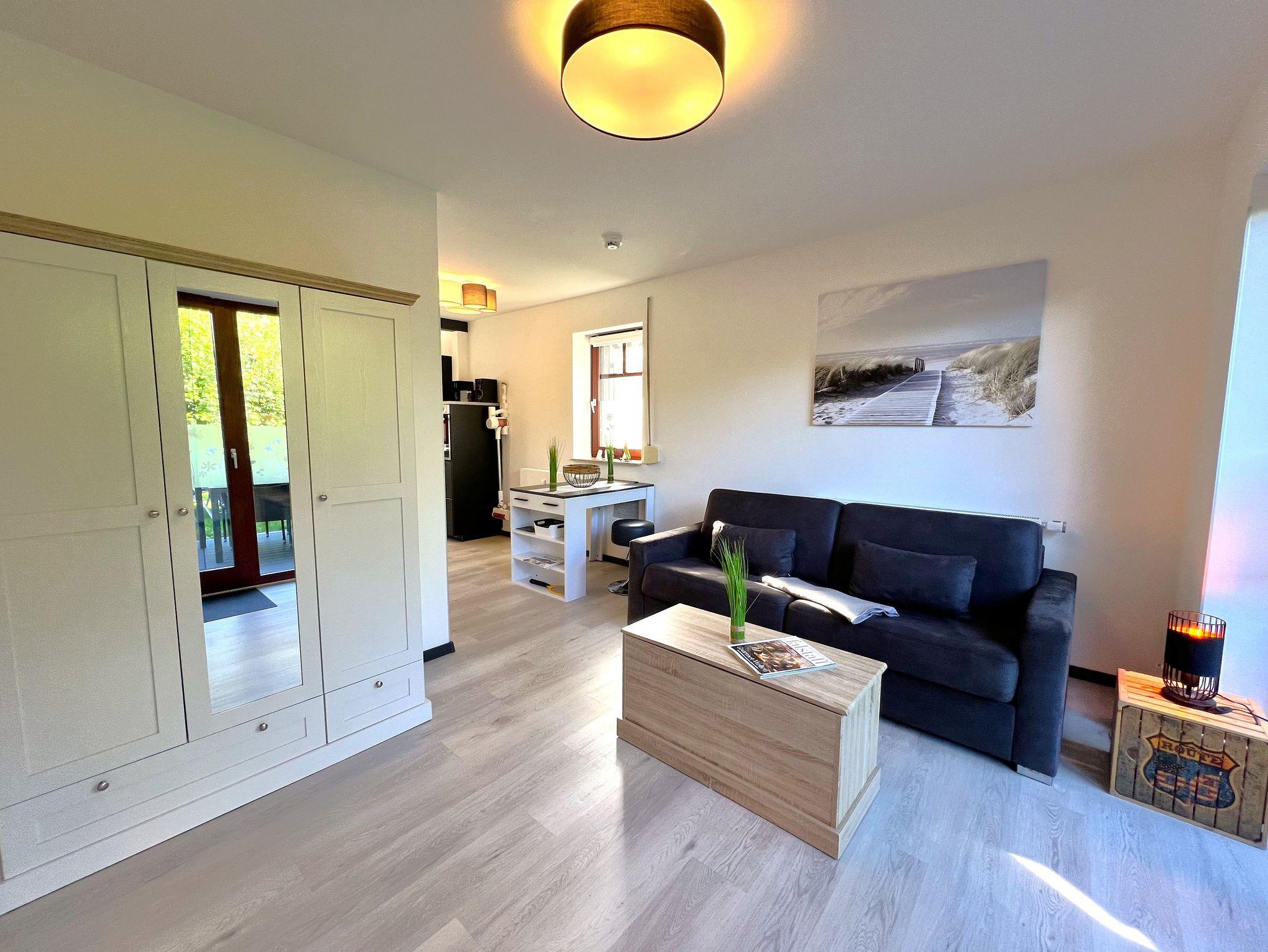 Moderne 1-Zimmer-Wohnung im Ferienpark Gustow mit Terrasse, Garten und naher Badestelle auf Rügen – ideal für erholsame Urlaubstage.