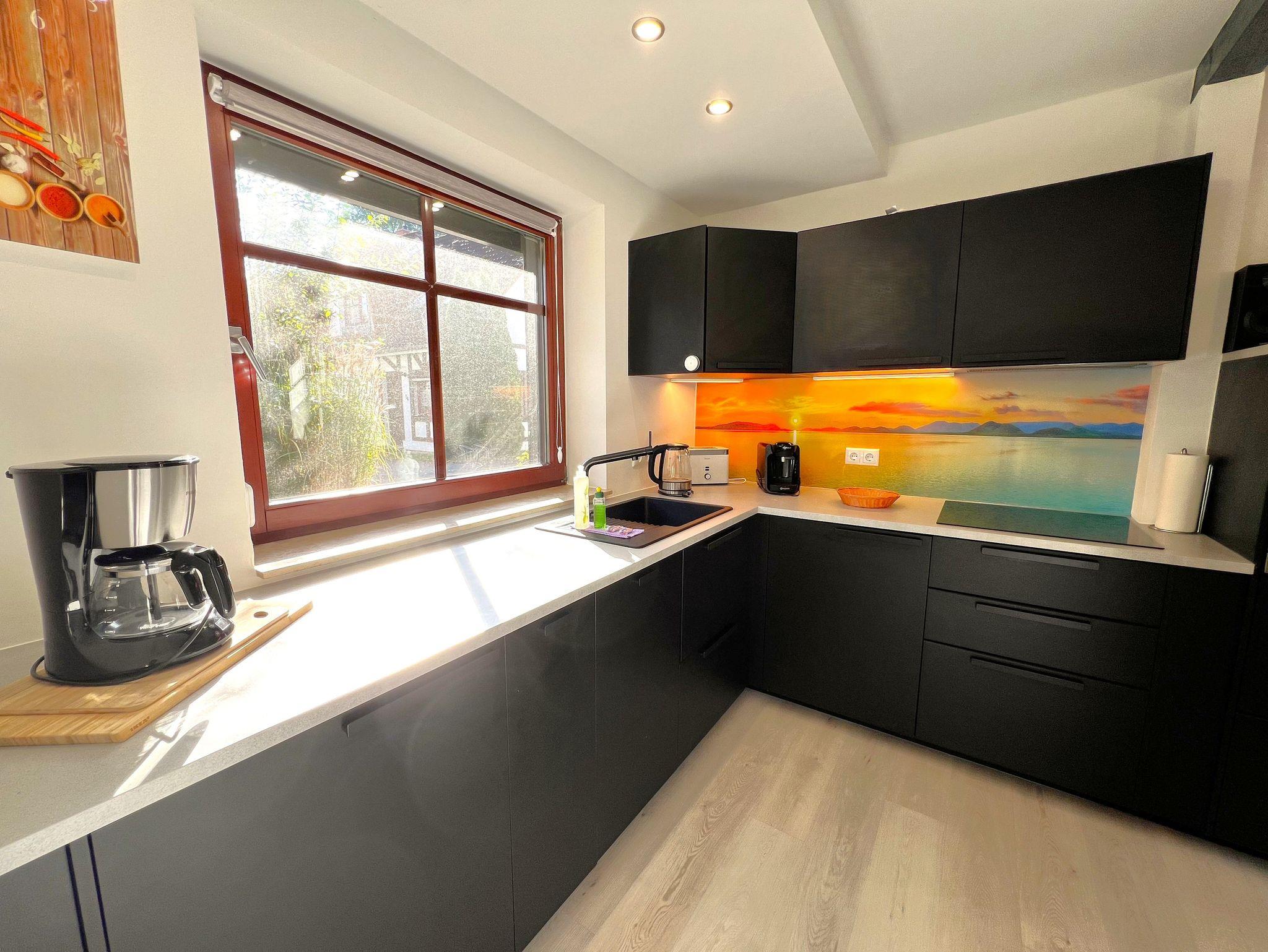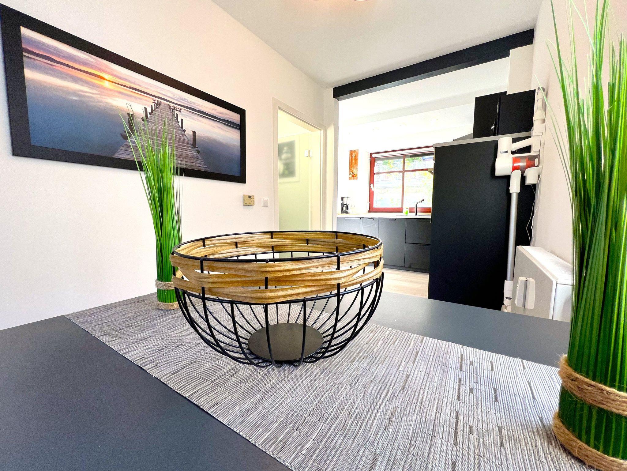 Diese moderne 1-Zimmer-Wohnung besticht durch ein lichtdurchflutetes Wohnzimmer mit direktem Zugang zur Terrasse und einem gepflegten Garten. Die offene Küche ist in elegantem Schwarz gehalten und bietet hochwertige Elektrogeräte sowie ausreichend Stauraum. Das stilvolle Badezimmer überzeugt mit einer großzügigen Regendusche und modernen Details. Der Außenbereich mit Sitzgelegenheiten lädt zum Entspannen ein und bietet viel Privatsphäre durch die dichte Bepflanzung. Diese Wohnung vereint Komfort und Stil in einer ruhigen Lage und ist ideal für Singles oder Paare.