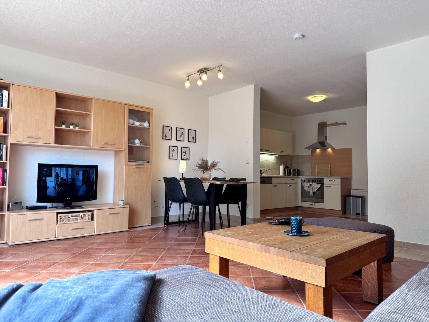 Der Wohnbereich ist offen gestaltet und mit einer zum Wohnzimmer hin offenen Küche verbunden. Eine Sofaecke mit Sofa, Sessel, TV und Radio schafft einen angenehmen Rahmen für gemeinsame Abende oder ruhige Stunden nach Ihren Ausflügen. Ein Essbereich mit Esstisch ergänzt den Wohnraum und bietet Platz für gemeinsame Mahlzeiten. Sichtschutz an allen Fenstern unterstützt Ihre Privatsphäre.