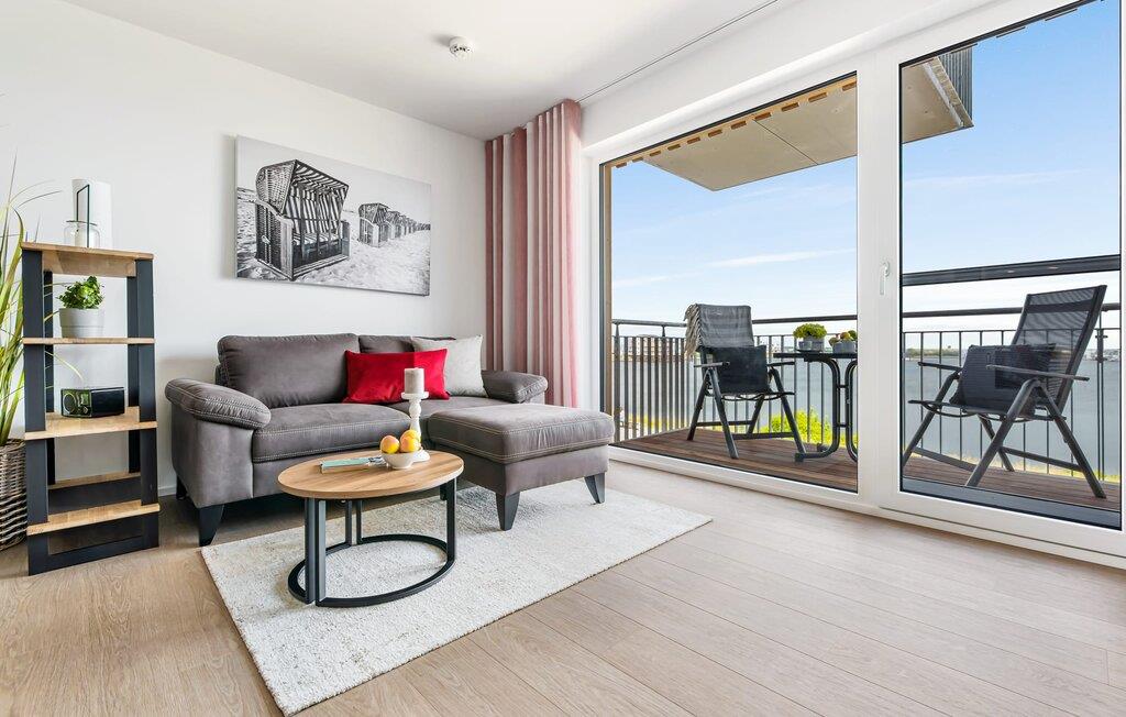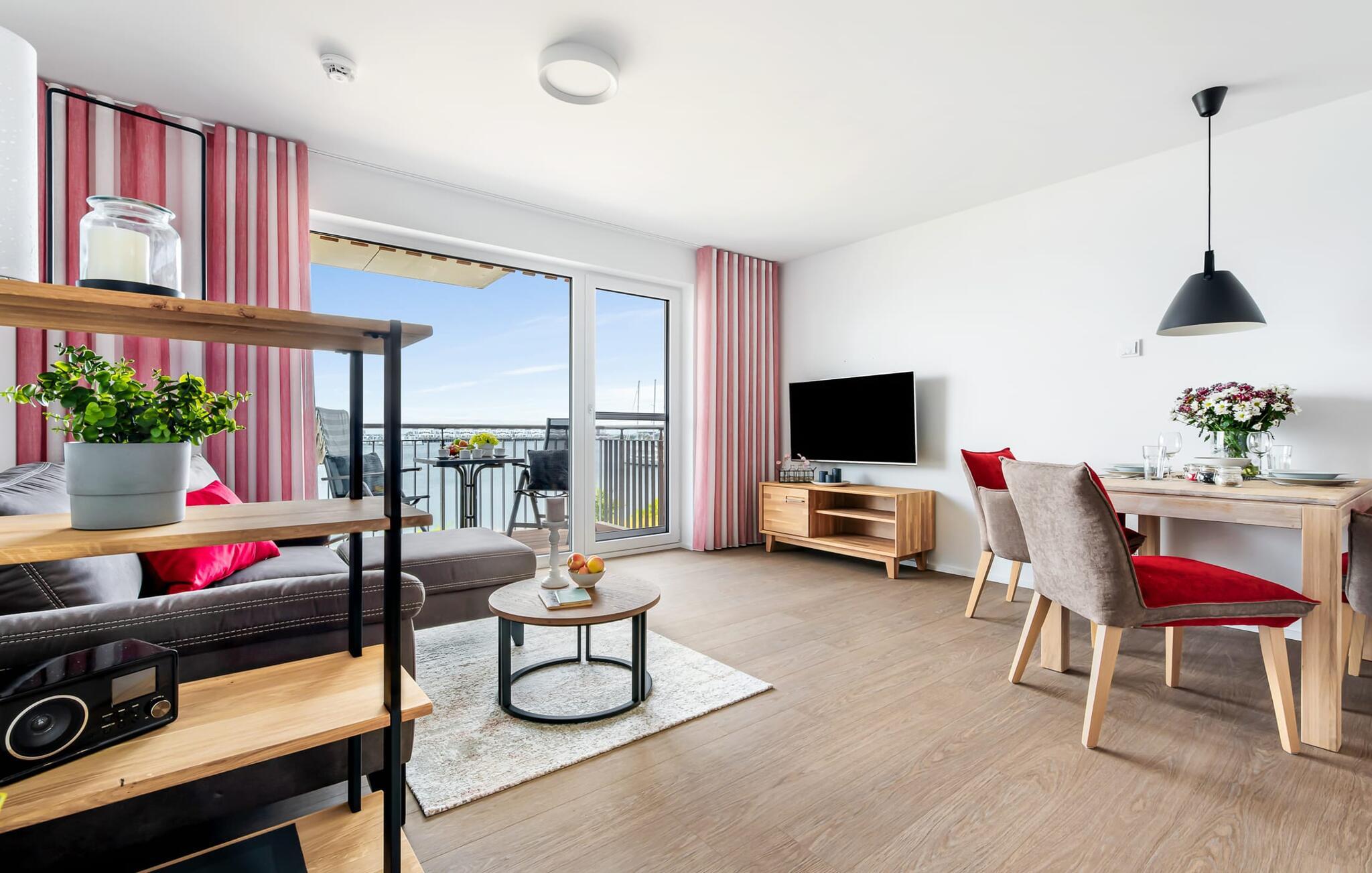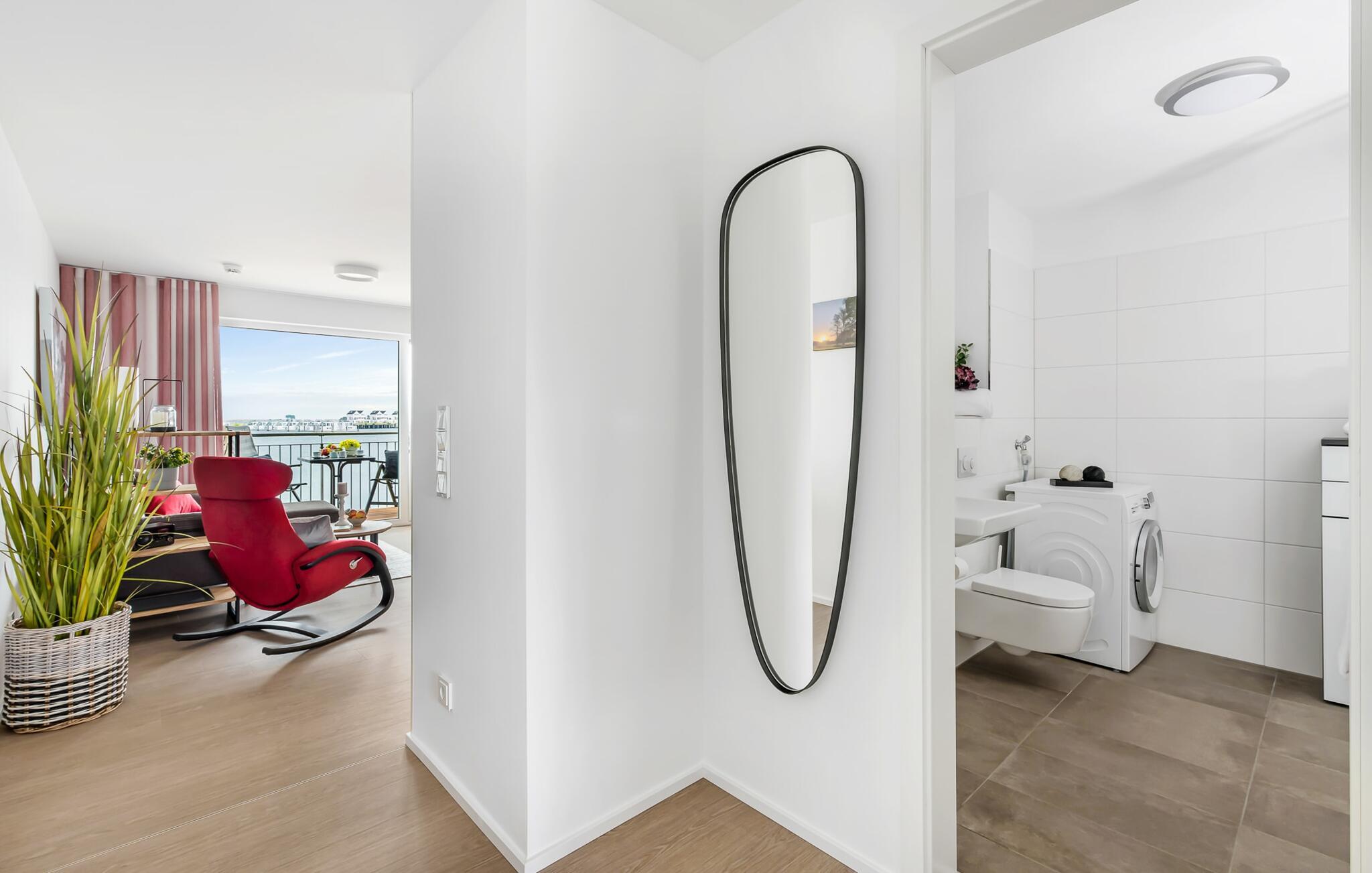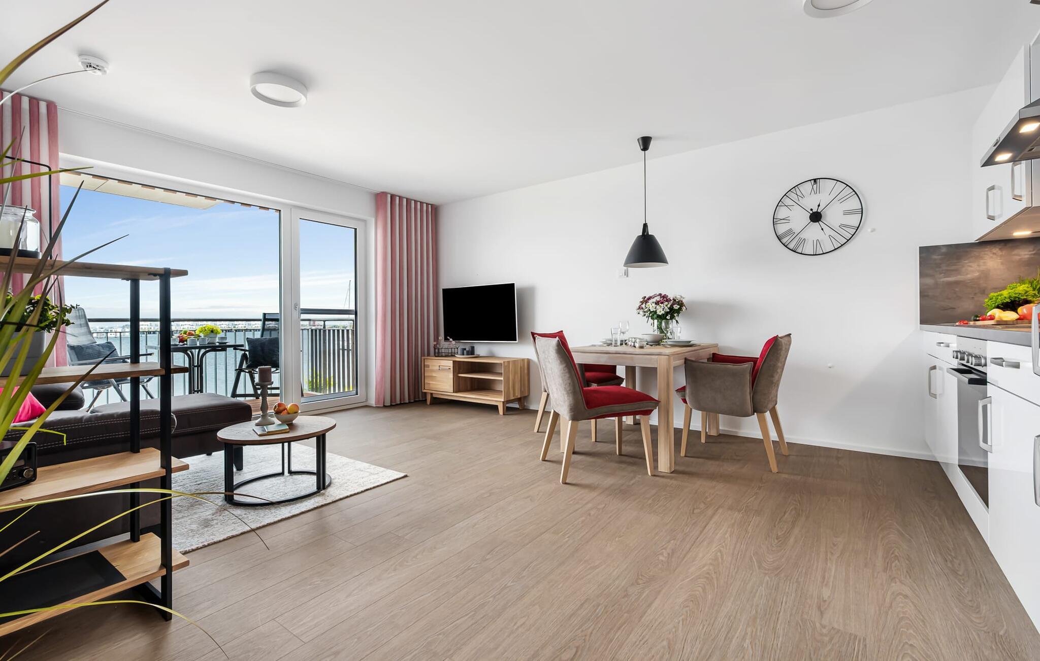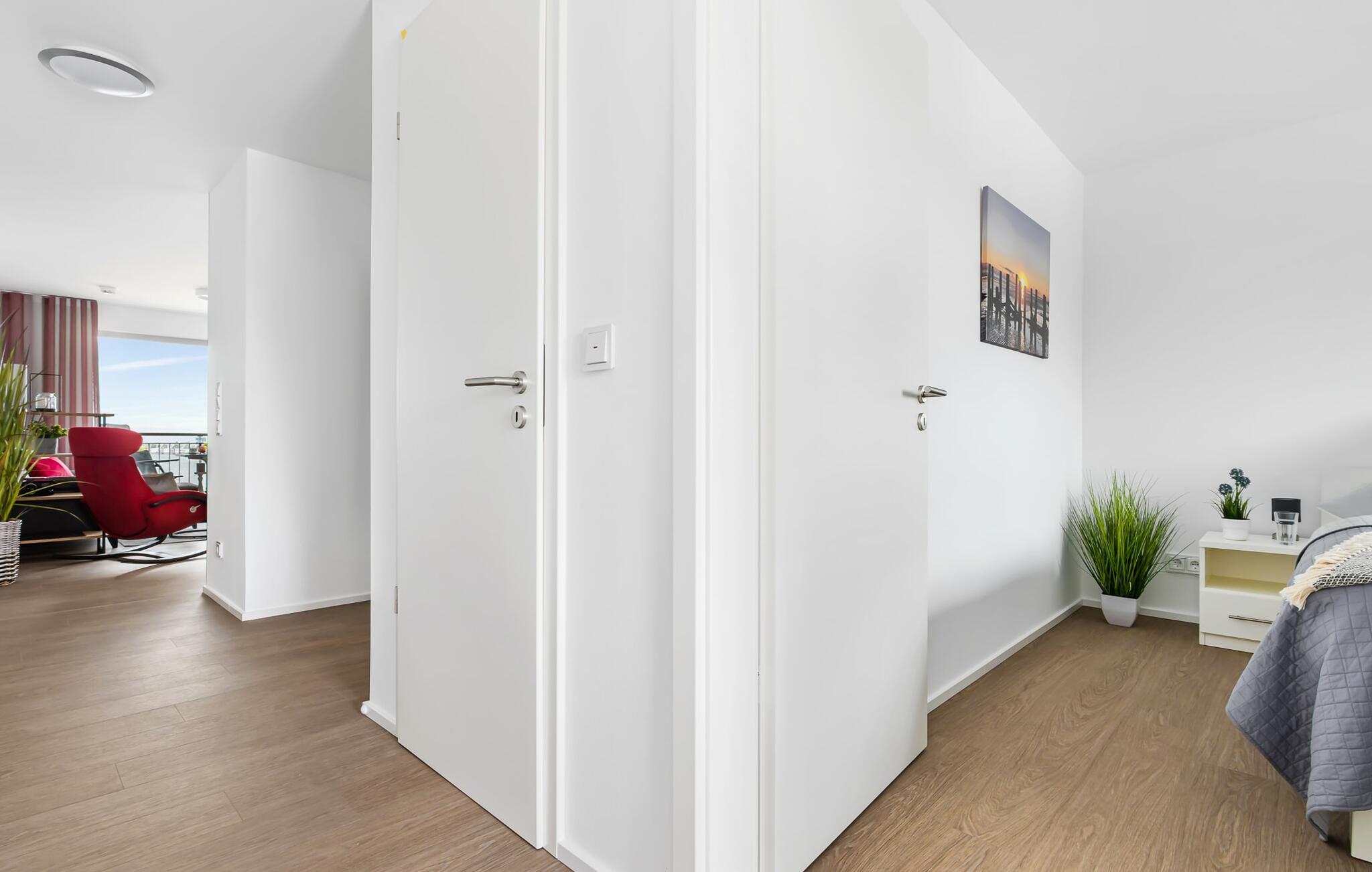 Schließt die Wohnungstür auf, tretet ein und fühlt euch einfach nur wohl! Euer Blick fällt direkt durch die bodentiefen Fenster über den Balkon auf den Hafen und Wasser bis zum Horizont: Der Alltag ist bereits vergessen.