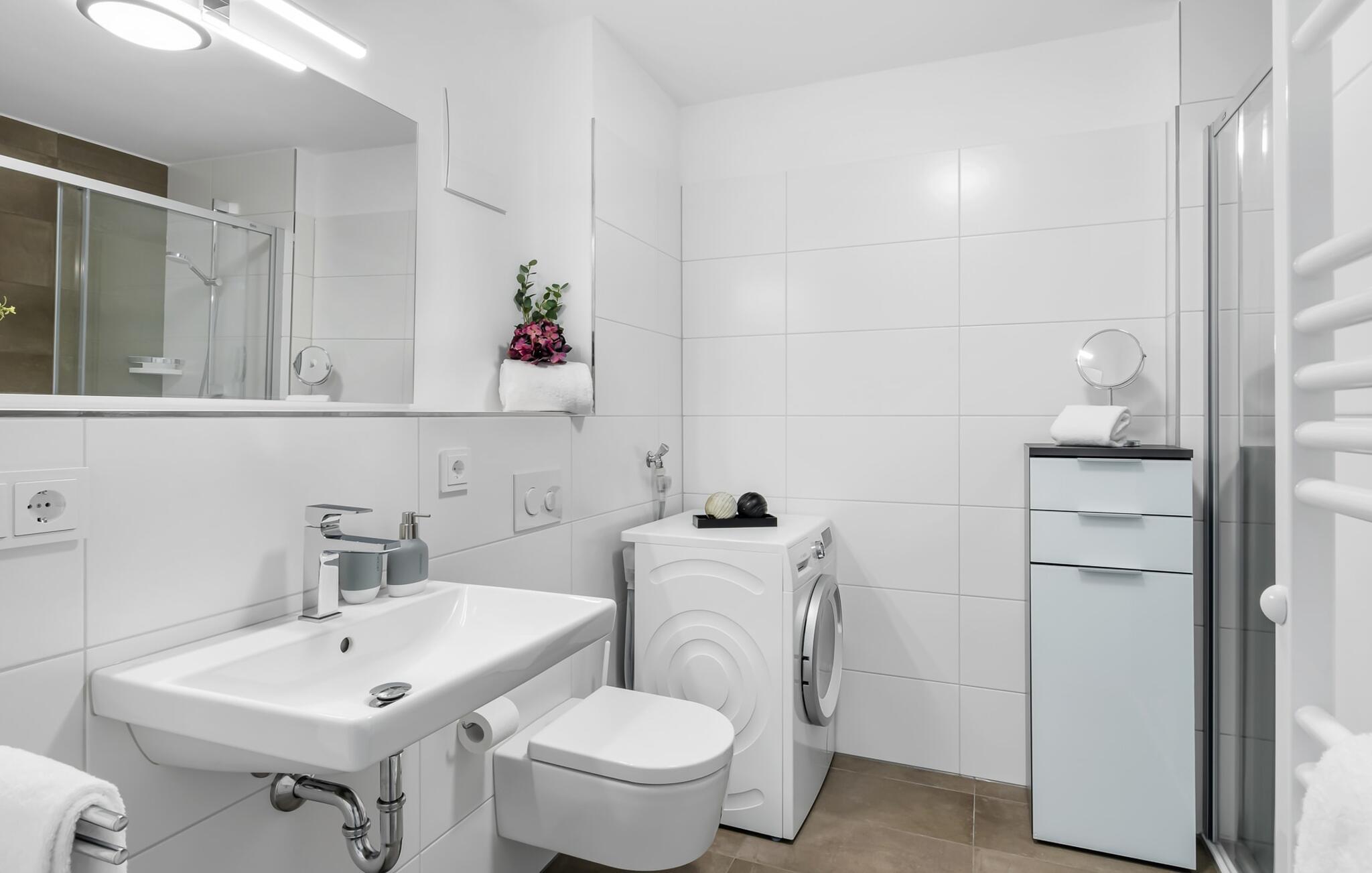 Im Badezimmer befindet sich eine bodengleiche Dusche und alles, was man sonst für's tägliche Wohlbefinden braucht.