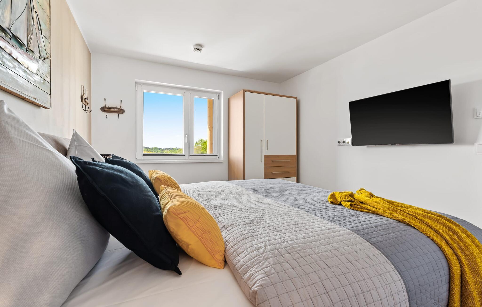 Im Schlafzimmer garantiert ein erhöhtes Polsterdoppelbett (180x200cm) für erholsamen Schlaf und im großen Bettkasten lassen sich eure Koffer bequem verstauen. Ein Fernseher sorgt für Unterhaltung bei Schietwetter.