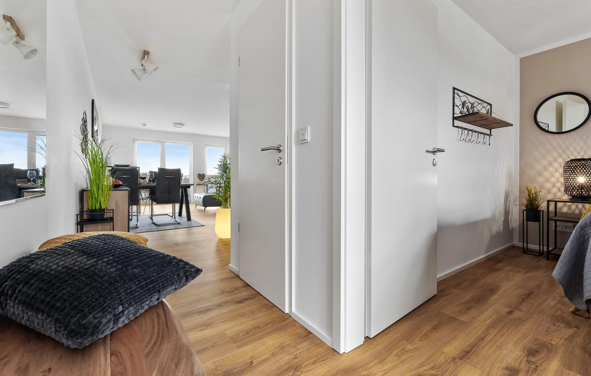 Kaum hat man den Hafendiamanten betreten, stellt sich Urlaubsstimmung ein. Der Blick aus dem kombinierten Wohn-Esszimmer mit Küchenzeile fällt direkt über den Balkon auf die Marina mit den Schiffen und ihrem bunten Treiben. Und weiter schweift der Blick über die schwimmenden Häuser, den Ostseefjord Schlei bis hin zum Leuchtturm von Schleimünde und dann hinaus auf die Ostsee. Schöner kann Ankommen nicht sein!