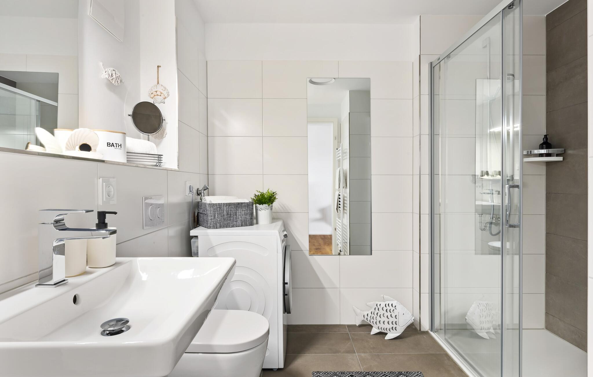 Das Bad lässt ebenfalls keine Wünsche offen und bietet mit der bodengleichen Dusche eine wohltuende Erfrischung.