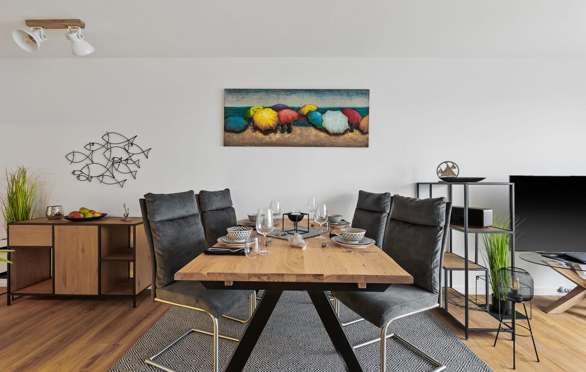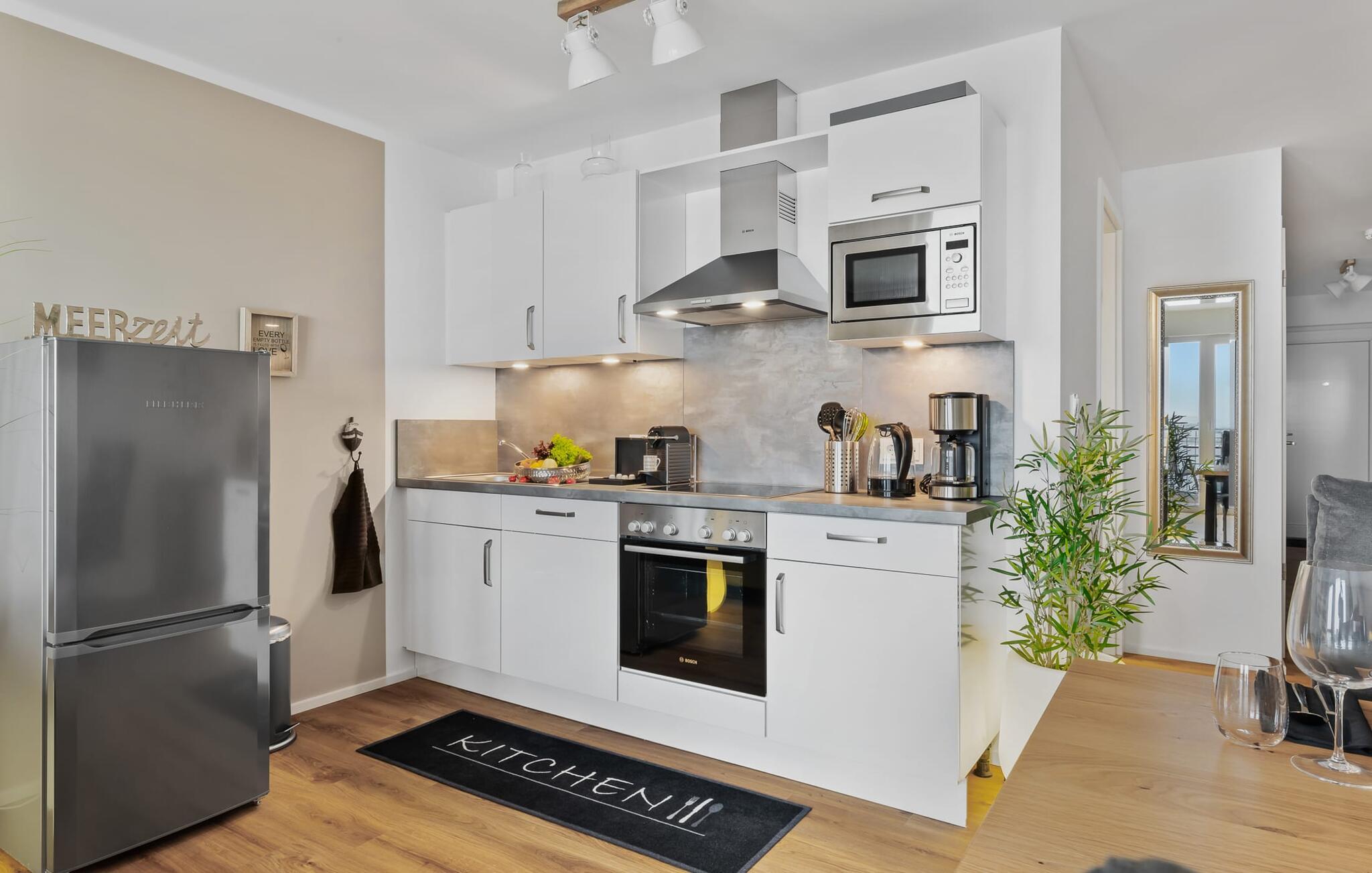 Modern, hochwertig und gemütlich eingerichtet fühlt sich der Gast vom ersten Moment an wohl und kann sich fallen lassen. Egal, ob man auf dem großen, bequemen Ecksofa mit Relaxfunktion entspannt oder fernsieht, am Esstisch sitzt oder in der bestens ausgestatteten Küche Mahlzeiten bereitet, der Blick auf Schiffe und Wasser ist immer dabei.