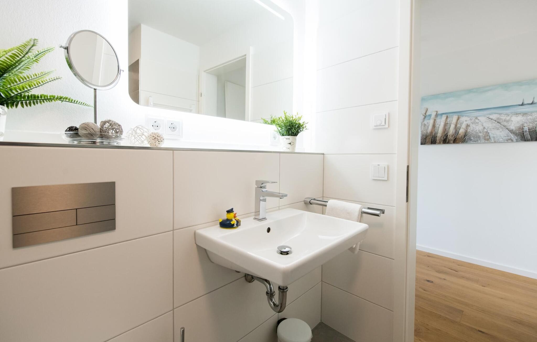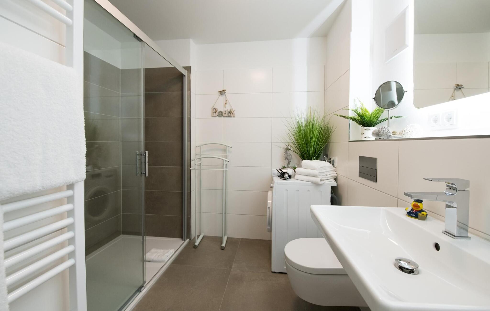 Das Duschbad verfügt über eine große bodengleiche Dusche.