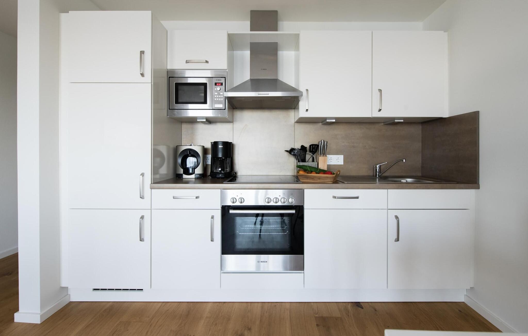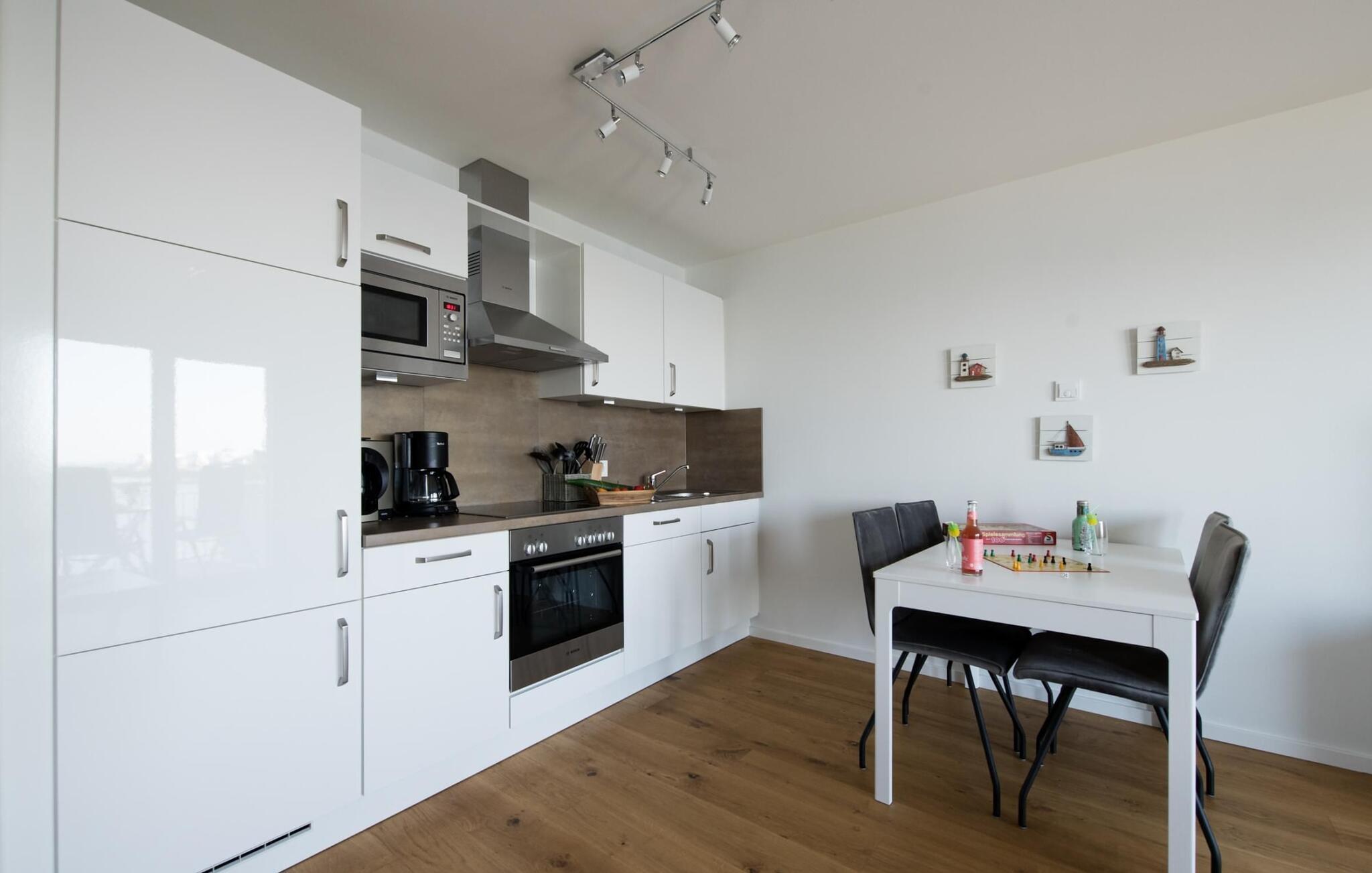 Die umfangreich ausgestattete offene Küche lässt keine Wünsche offen. Hier lassen sich köstliche Urlaubsmahlzeiten zaubern. Der Balkon lädt zu einem Grillabend bei Wasserblick ein.