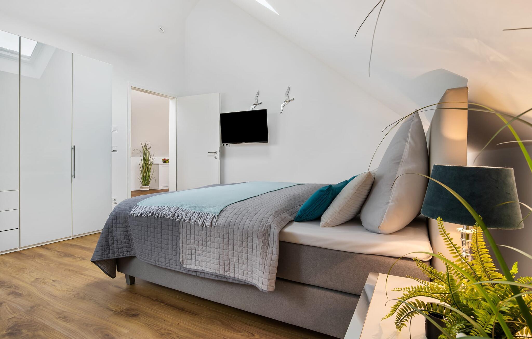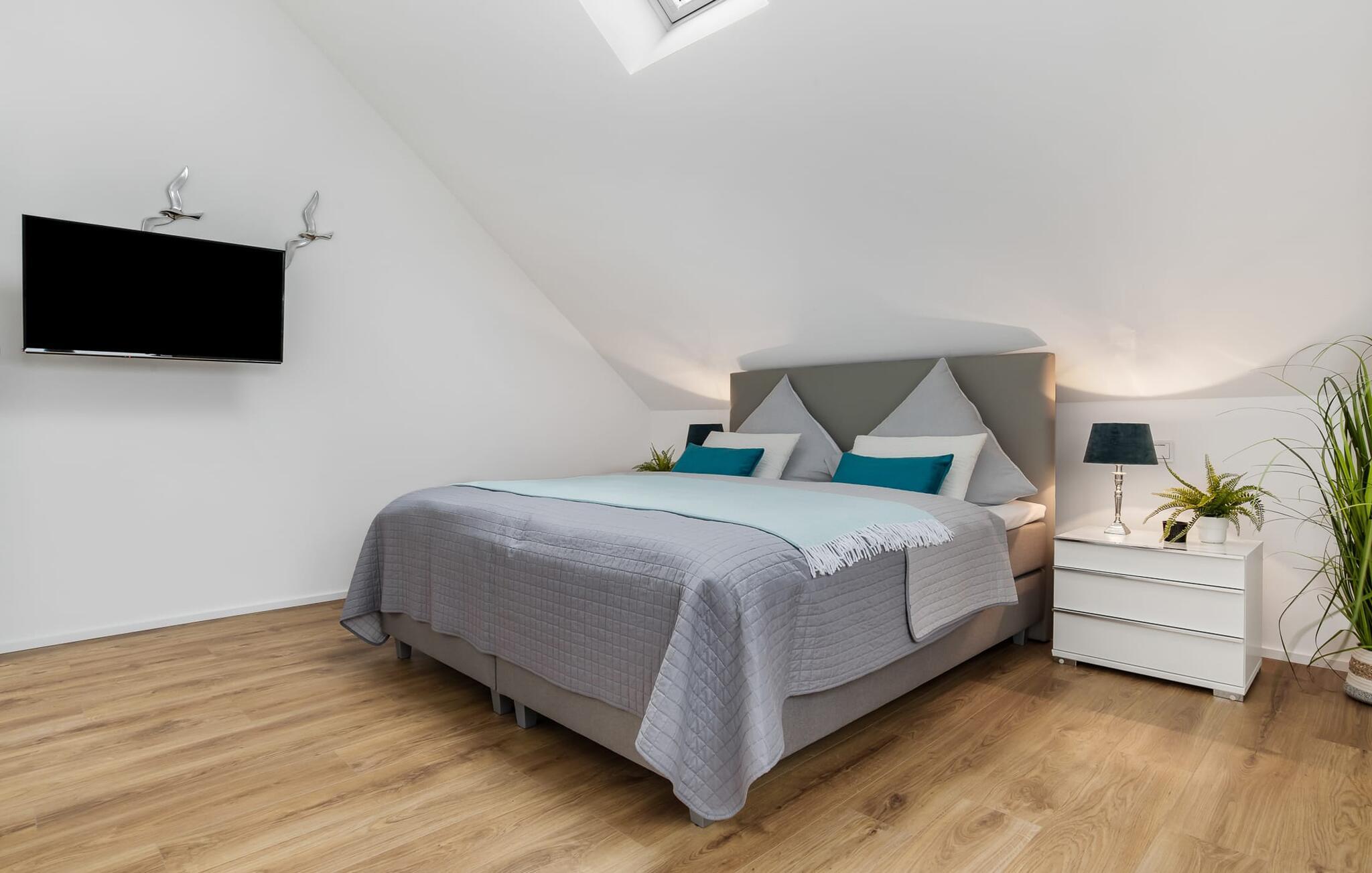 Das Schlafzimmer bietet mit seinem komfortablen Doppelbett und einem weiteren Fernseher die besten Voraussetzungen für einen entspannten Schlaf. Das Schlafzimmer ist verdunkelbar, sodass erholsamen Stunden nichts im Wege steht.