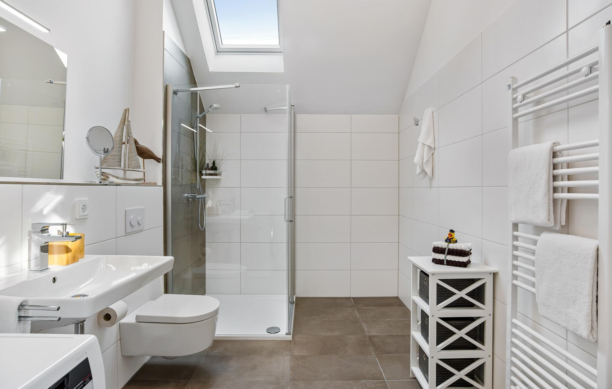 Im geräumigen Bad befindet sich neben allem Nützlichen eine bodengleiche Dusche für den gelungenen Start in einen neuen Urlaubstag.