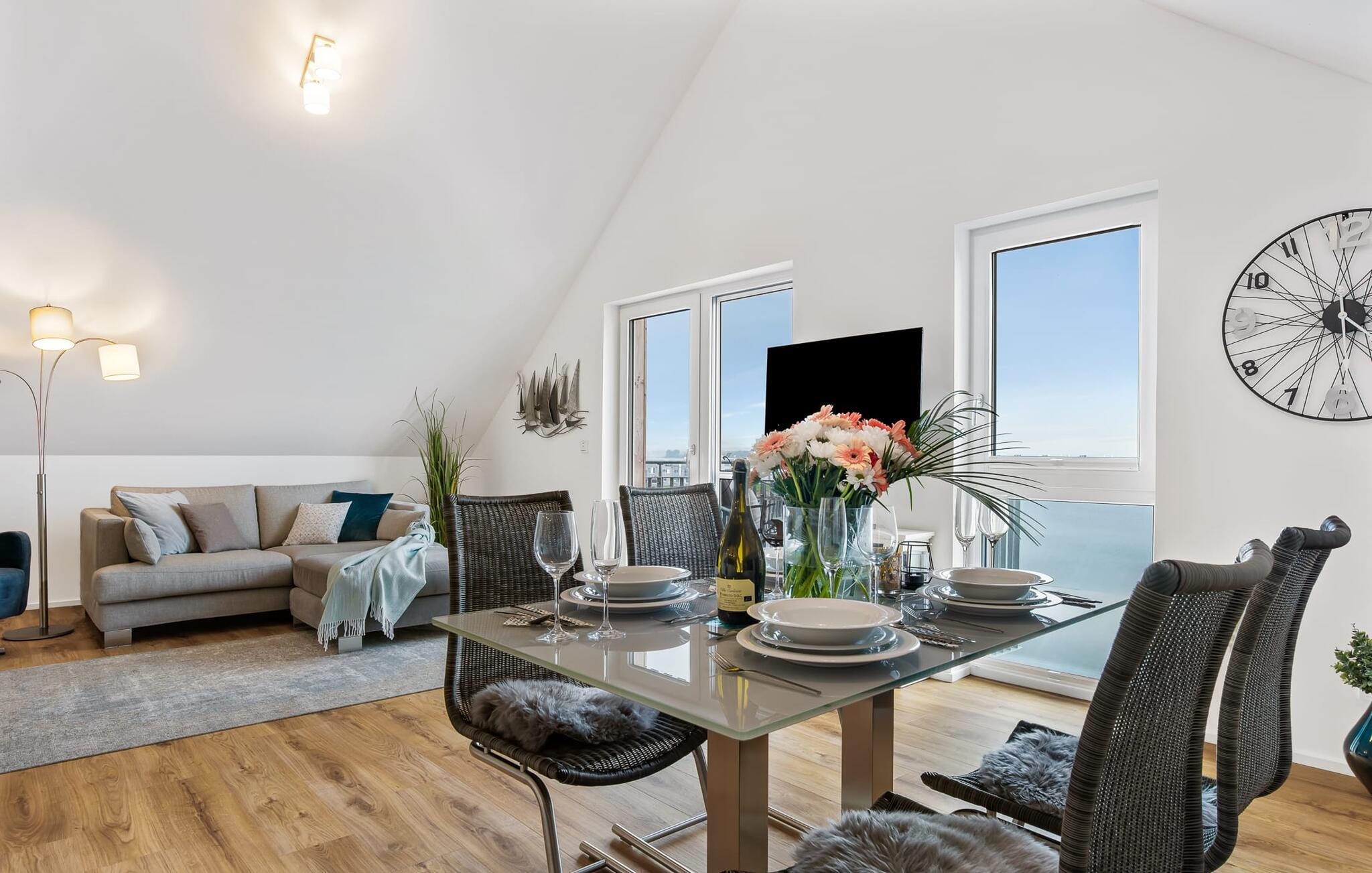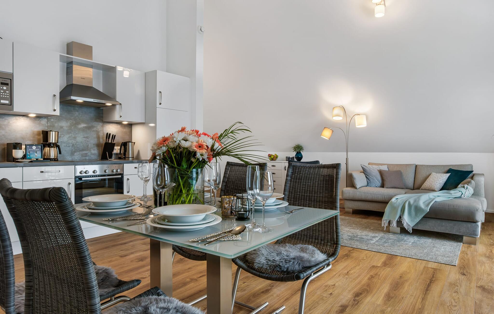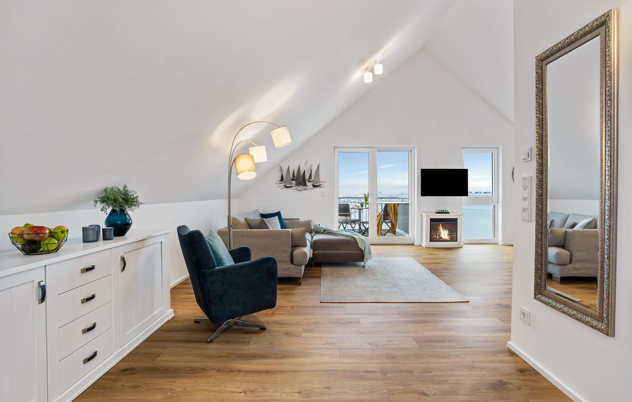 Die im modernen Sylt-Living Design eingerichtete Ferienwohnung ist hell und freundlich und strahlt Gemütlichkeit aus. Wohlfühlen fällt hier nicht schwer! Die integrierte Küchenzeile im Wohn-/Essbereich ist vielseitig ausgestattet und lädt zum gemeinsamen Kochen ein. Im Wohnbereich laden das bequeme Sofa, ein Big Seat sowie ein Relax-Sessel zum Verweilen ein und ein Fernseher sorgt für Abwechslung zum Hafenkino. Bei gutem Wetter könnt ihr die Vorzüge des Hafenjuwels auf dem angrenzenden Balkon genießen. An kühleren Tagen sorgt der Elektrokamin für Wärme und Gemütlichkeit.