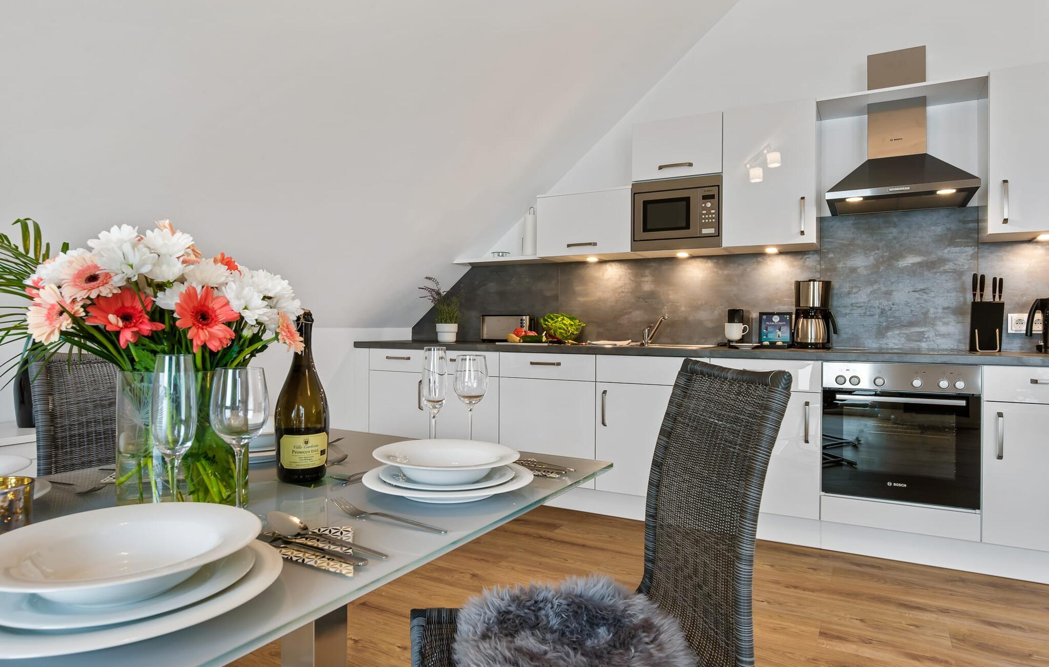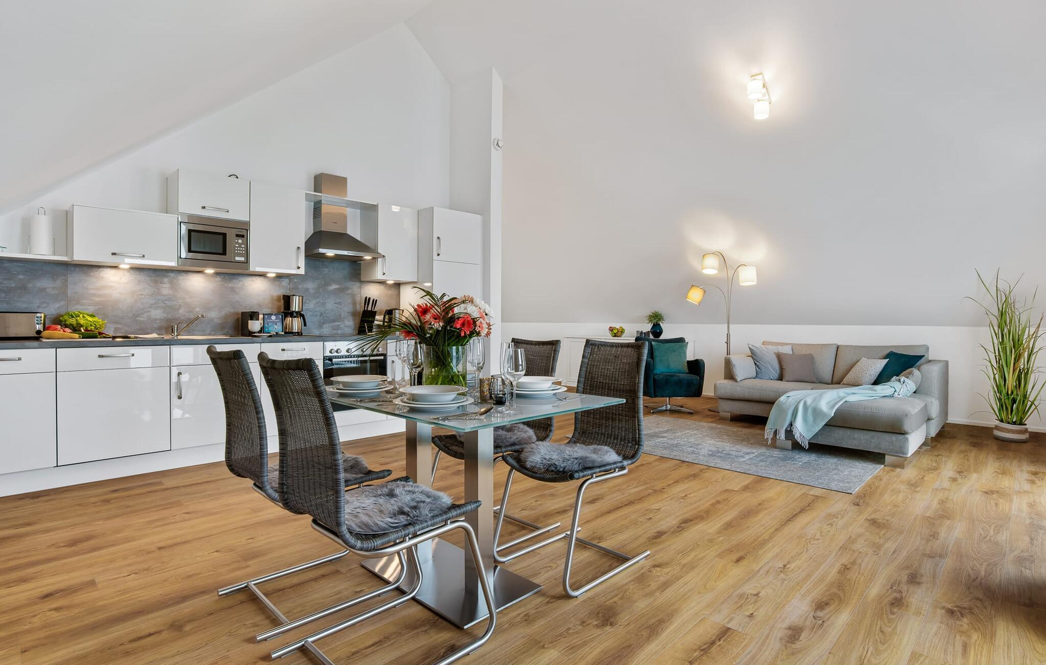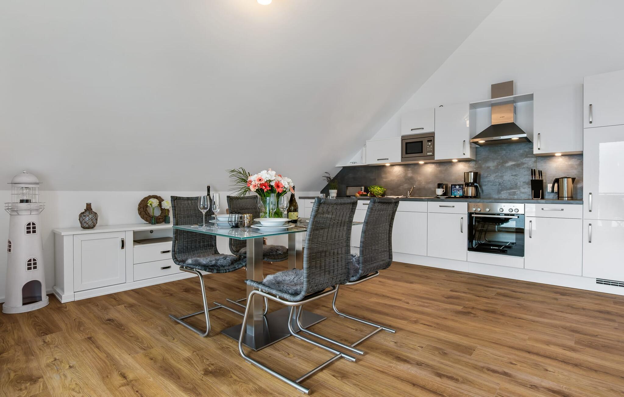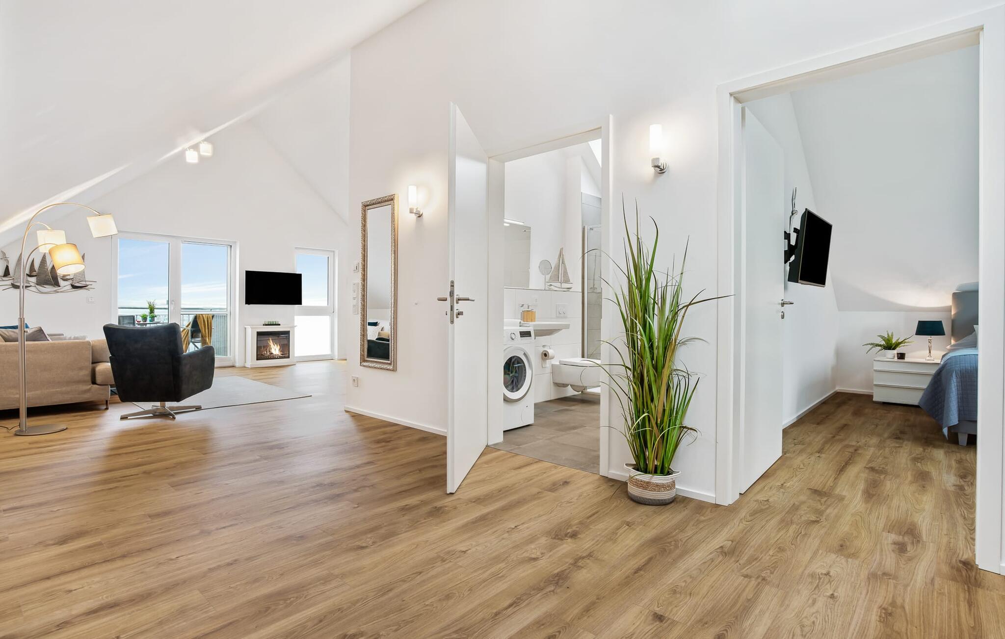 Die im modernen Sylt-Living Design eingerichtete Ferienwohnung ist hell und freundlich und strahlt Gemütlichkeit aus. Wohlfühlen fällt hier nicht schwer! Die integrierte Küchenzeile im Wohn-/Essbereich ist vielseitig ausgestattet und lädt zum gemeinsamen Kochen ein. Im Wohnbereich laden das bequeme Sofa, ein Big Seat sowie ein Relax-Sessel zum Verweilen ein und ein Fernseher sorgt für Abwechslung zum Hafenkino. Bei gutem Wetter könnt ihr die Vorzüge des Hafenjuwels auf dem angrenzenden Balkon genießen. An kühleren Tagen sorgt der Elektrokamin für Wärme und Gemütlichkeit.