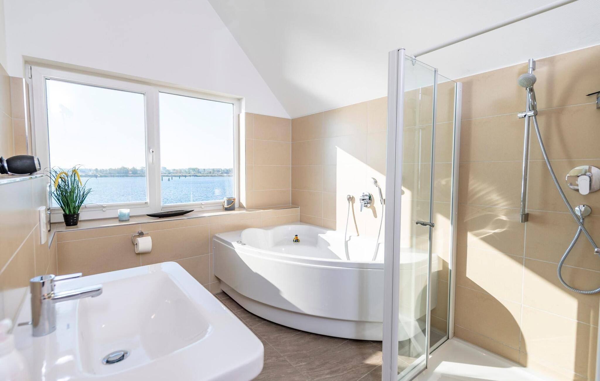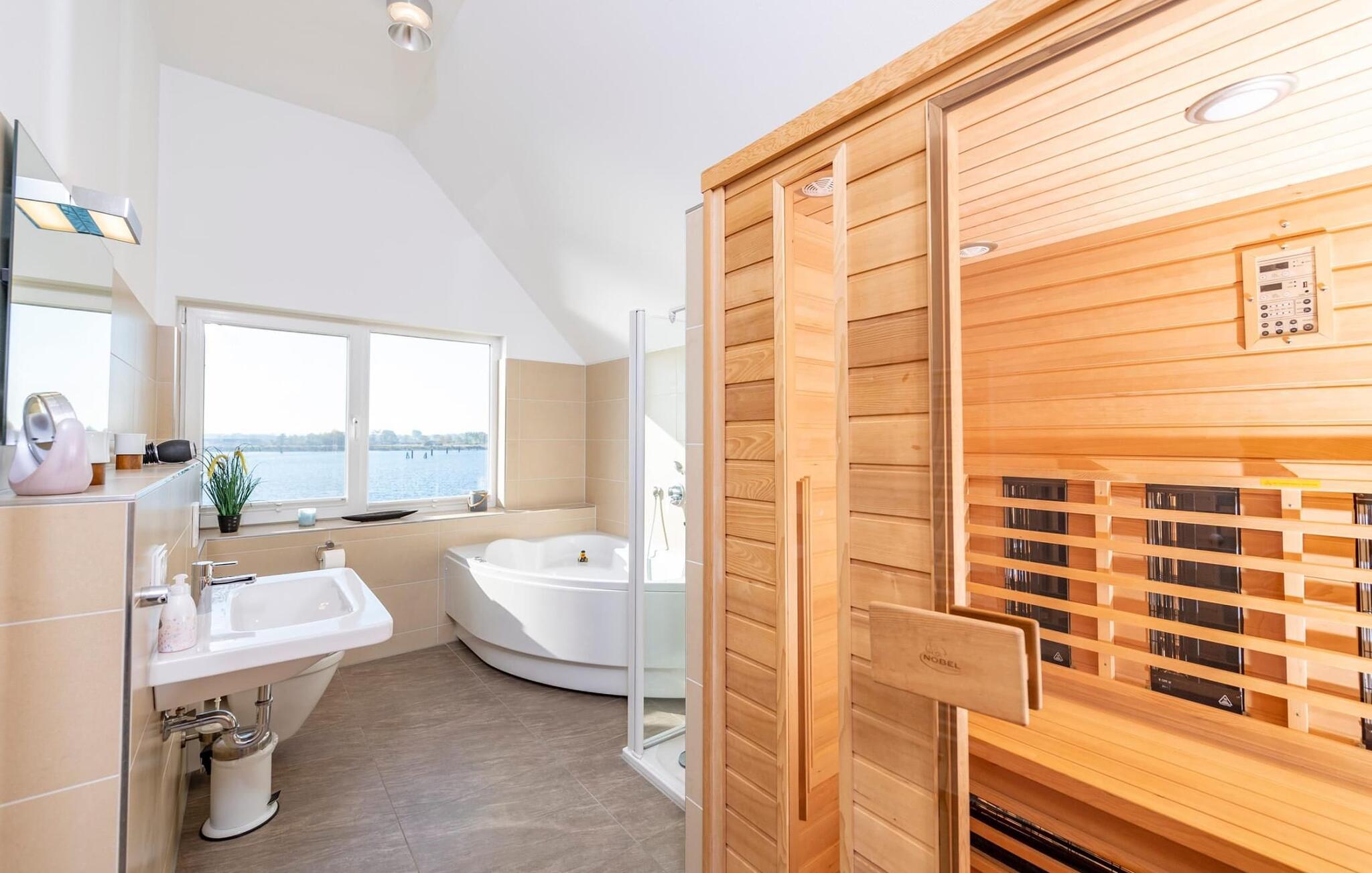 In dem großzügigen Hauptbadezimmer befinden sich für das persönliche Wohlfühlprogramm einer Whirlpool-Badewanne, eine Dusche und eine Infrarot-Sauna (Wärmekabine) mit Lichttherapiefunktion bei Ausblick auf den Hafen.