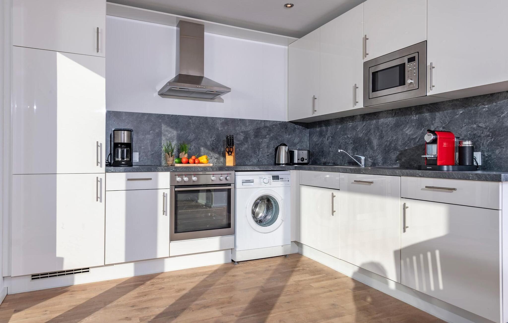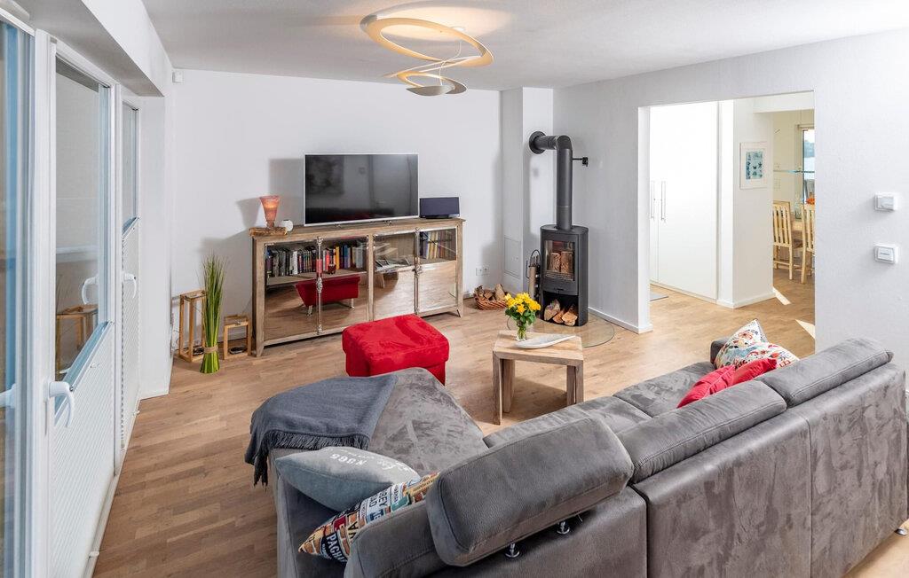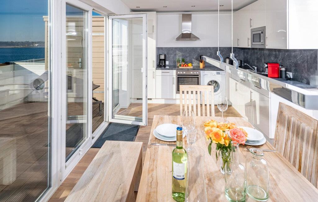 Die Ferienwohnung ist sehr hochwertig und stilvoll in moderner Form eingerichtet. Sie bietet an anspruchsvoller Ausstattung auf zwei Wohnebenen alles für einen rundum gelungenen Urlaub am Meer. Der offene Wohn- /Essbereich in der unteren Ebene mit bodentiefen Fenstern, Sitzlandschaft und Esstisch ist der Mittelpunkt des Hauses. Hier finden bei weitem Blick auf die Schlei und Ihre Mündung gemütliche Momente vor dem Kaminofen statt. Gemeinsame Mahlzeiten, die in der anliegenden voll ausgestatteten Küche gezaubert werden, können mit