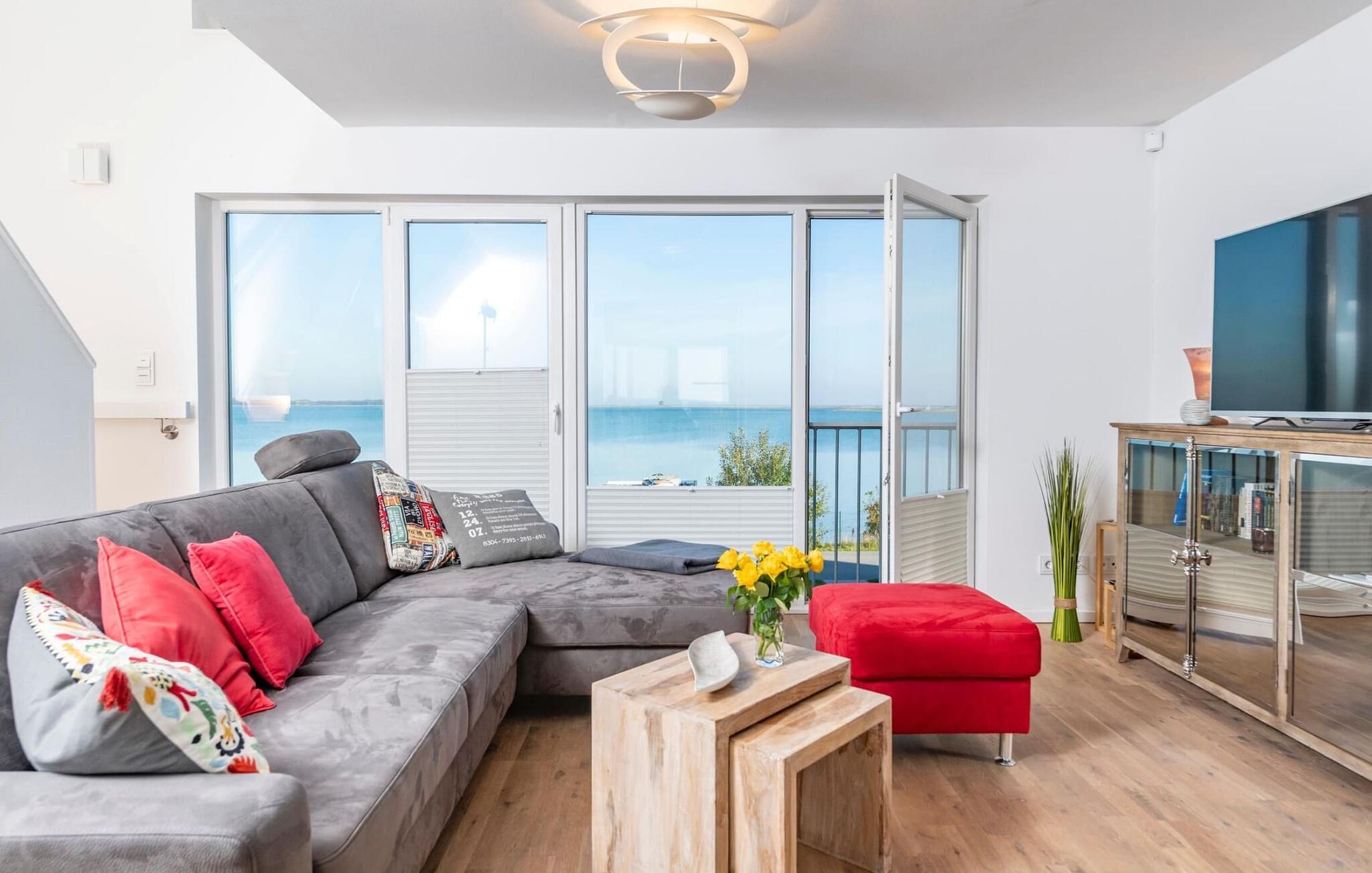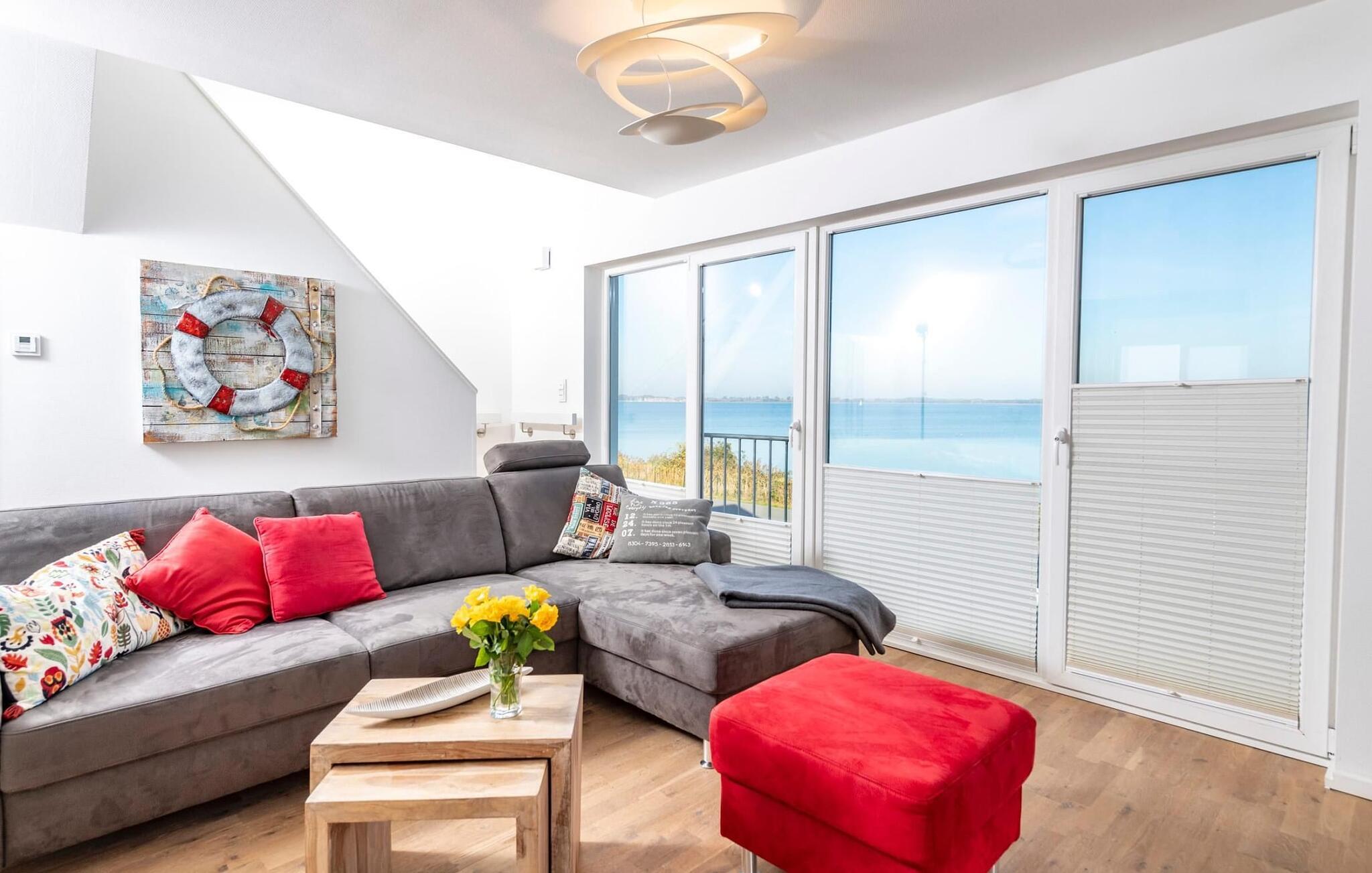 Unser Lieblingsplatz: Die komfortable Sitzlandschaft im Wohnbereich vor dem Kaminofen mit weitem Blick auf die idyllische Schlei und den Leuchtturm Schleimünde.